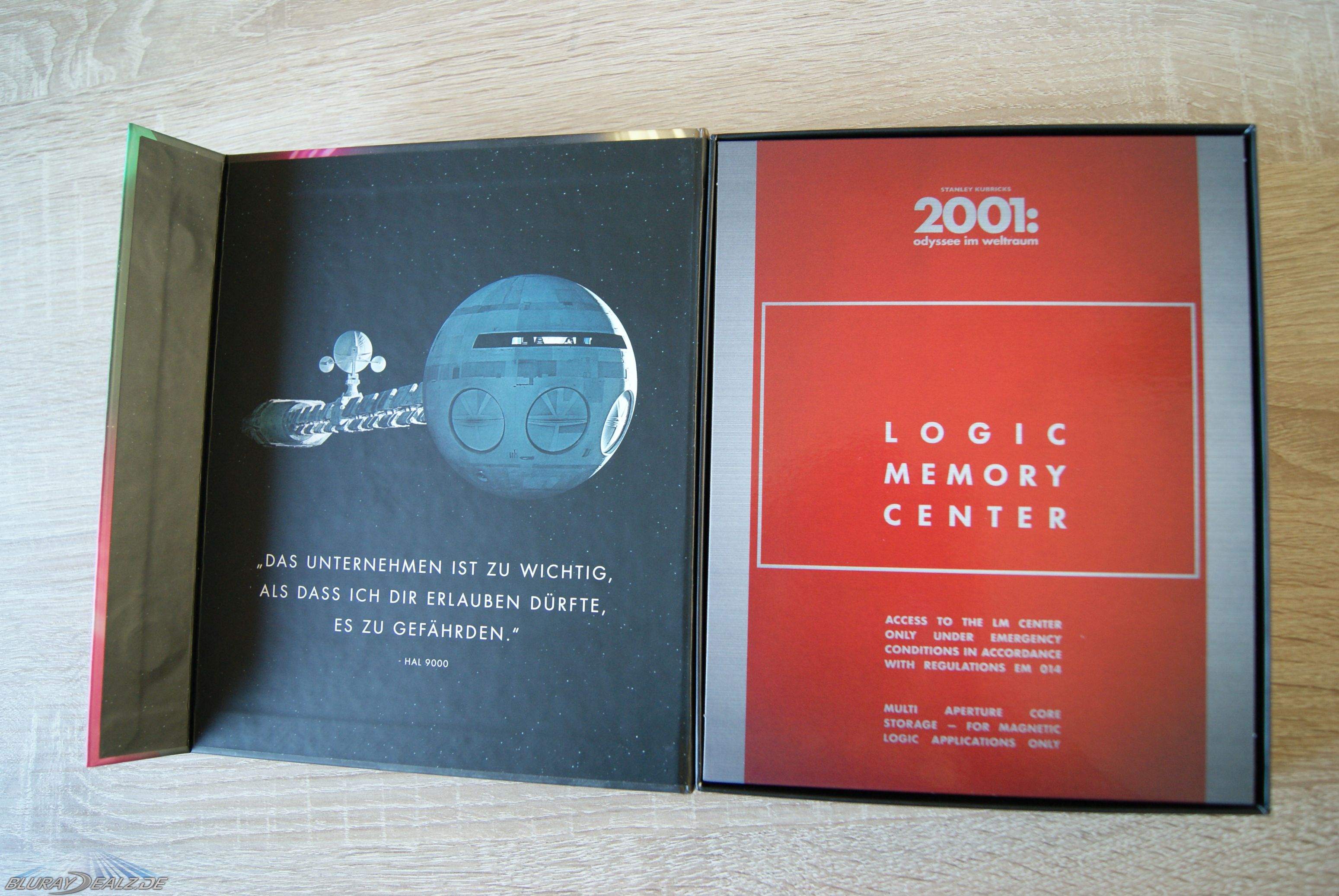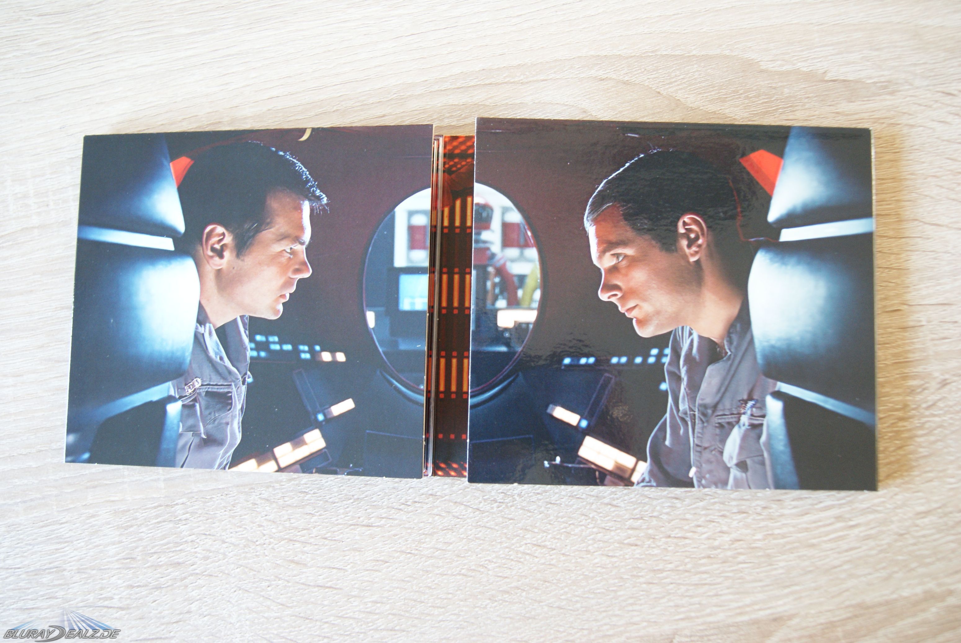 Ich liebe das Design bzw. insbesondere die für diese Editionen entworfenen Covermotiven. Auch hier haben wir vorne ein über drei Seiten gehendes Motiv, das seinesgleichen sucht, und recht in einem schicken Magnetverschluss ausläuft. Hinten sehen wir wieder ein Porträtmotiv aus dem Film. Das passt für mich schön und gehört sich inzwischen so für die „Film Vault“-Reihe. Innen finden wir im Deckel ein Bild des bekannten Raumschiffes nebst Zitat. Das sieht edel aus. Rechts sind die beiden Fächer für Digipack und Crystal nebst Ausziehbändchen. Hier hat der Crystal jedoch wieder etwas „gewütet“ und den Papprand leicht beschädigt.
