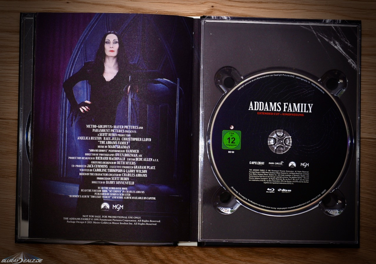 Das ist ein Capelight Mediabook. Die Größe entspricht also dem Capelight Standard mit einer 4K UHD Disc links, einer einfachen Blu-ray rechts und einem getackertem Booklet in der Mitte. Das Cover entspricht dem Kinoplakat. Ganz ehrlich ist mir das am liebsten. Nur solche Werbetexte wie: “Verrücktsein ist relativ“ finde ich überflüssig und sogar etwas ärgerlich. Zumal der Spruch im Original noch Sinn macht aber in der Übersetzung nicht. Hinten liegt eine Karte auf mit allen Informationen zum Film. Die Rückseite ziert das eiskalte Händchen. Das ist einfach aber entsprechend. Ein besonderes Finish sucht man vergebens. Das wäre schon schön gewesen, wertet es ein Mediabook doch immer auf. Das Papier hat dafür eine schöne Haptic, fühlt sich alt und richtig gewählt an. Die Disc und das Backdrop hinter den Discs ist leider nichts besonderes. Ein Spinnennetz ziert beides. Ich liebe es, wenn Discs mit dem Motiv harmonieren und im besten Fall der Hintergrund ein durchgehendes Bild ergibt. Leider ist das also nicht der Fall. Beim Booklet fällt auf, dass wirklich viel Text vorhanden ist. Das liest sich nicht in 2 Minuten runter. Author ist Marco Heiter. Er schafft es zwar anspruchsvoll aber auch amüsant und verständlich Verbindungen von der Addams Family zu Foucault und Freud zu ziehen. Ich mochte es sehr. Das Layout ist sehr einfach. Die Bilder sind gut gewählt. Insgesamt ist das alles vom Design (gemeint ist nicht der Inhalt) ok.