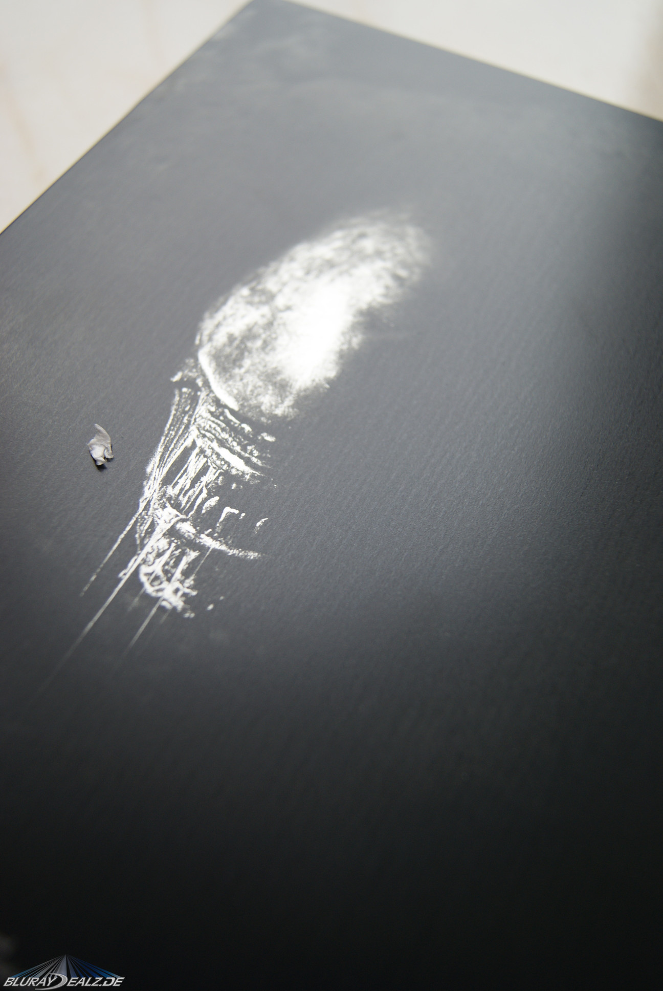 Ich hatte bis zuletzt auf eine Titelprägung gehofft und wurde leider enttäuscht. Trotzdem hat das schmutzig wirkende schwarz/graue und matte Cover was. Es wirkt alt und das passt. Das Bild des Alien ist bei genauerem Hinsehen von rotem Blut durchzogen, was wiederum zu einer interessanten Plastizität des Bildes führt.