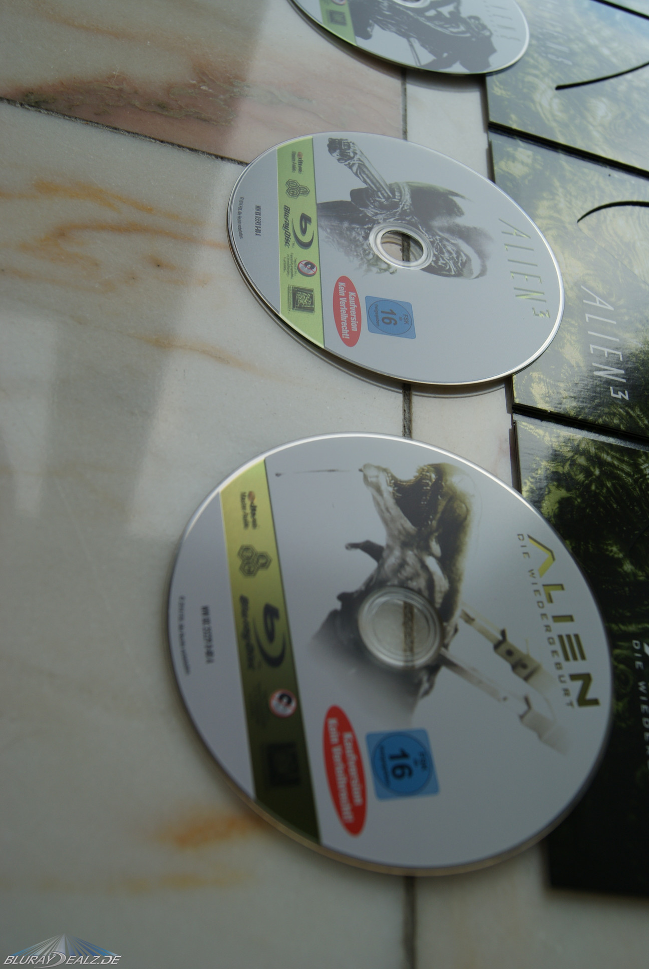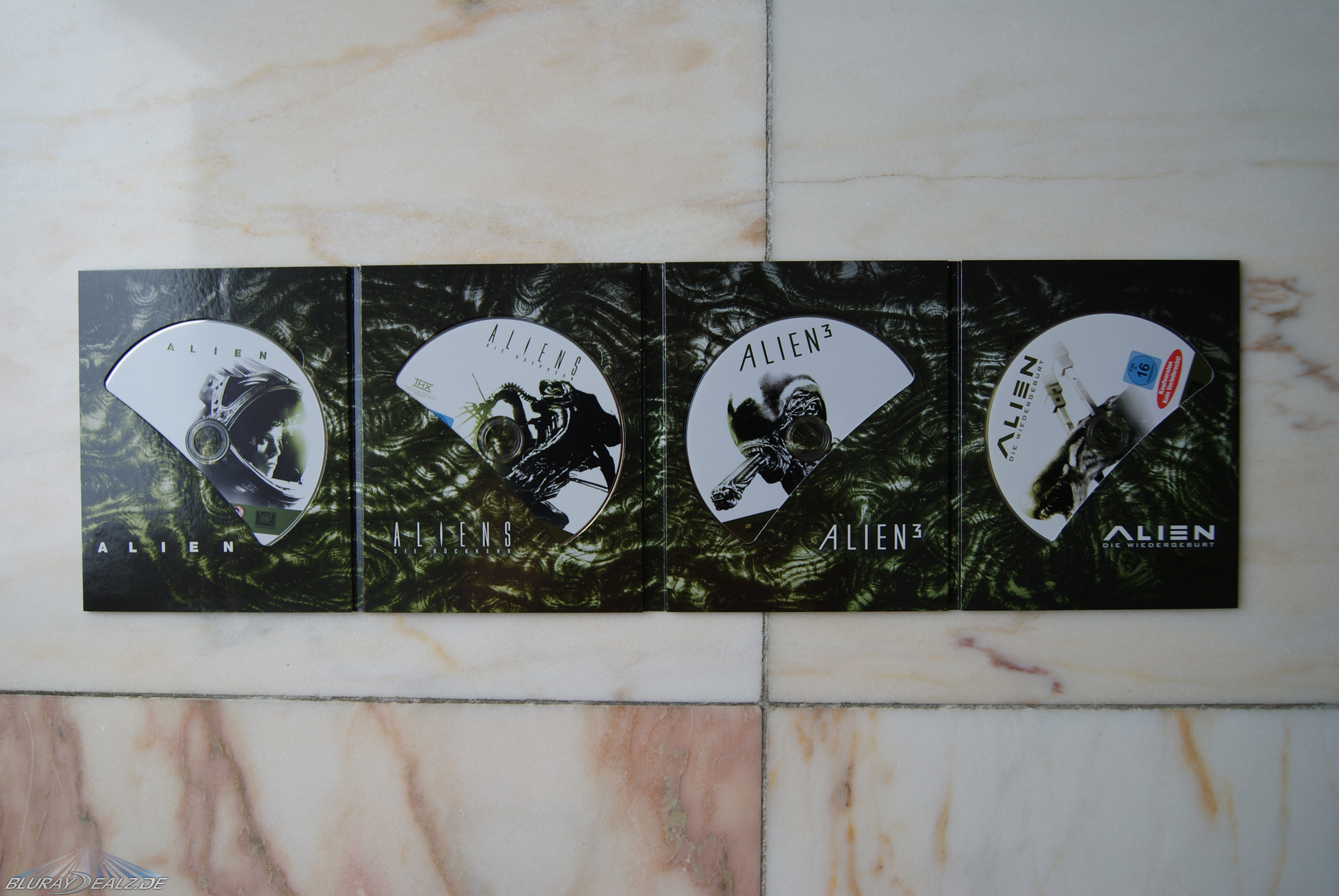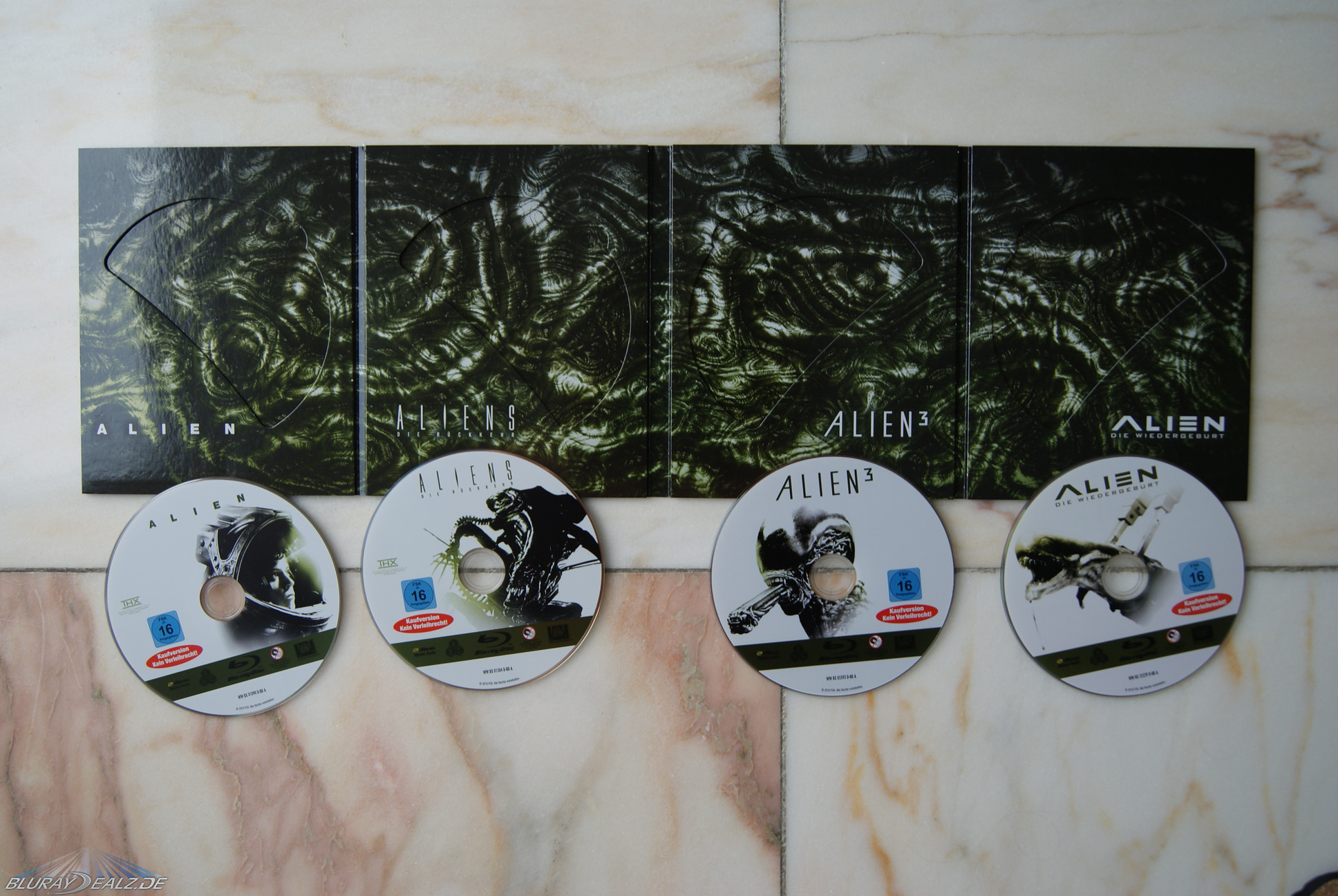 Der Innopack, der den Diamond Luxe Editionen sehr ähnlich ist, ist in einem Full Slip mit rauer Oberfläche untergebracht. Der FSK-Flatschen auf dem Schuber ließ sich problemlos entfernen. Die Rückseite trägt die üblichen Informationen und auch eine Limitierungsnummer. Der Innopack im Inneren des Schubers hat eine glatte, glänzende Oberfläche. Die Bilder haben jeweils einen schönen, alien-artigen grünen Glanzeffekt. Der Innopack wird per Magnet verschlossen. Im Inneren befindet sich ein weiteres Motiv und die 4 Discs, die sicher untergebracht sind. Diese verfügen über ein einheitliches Design (mit einem grünglänzenden Blu-ray-Logo-Keil) und über verschiedene zum Film passende Motive.
