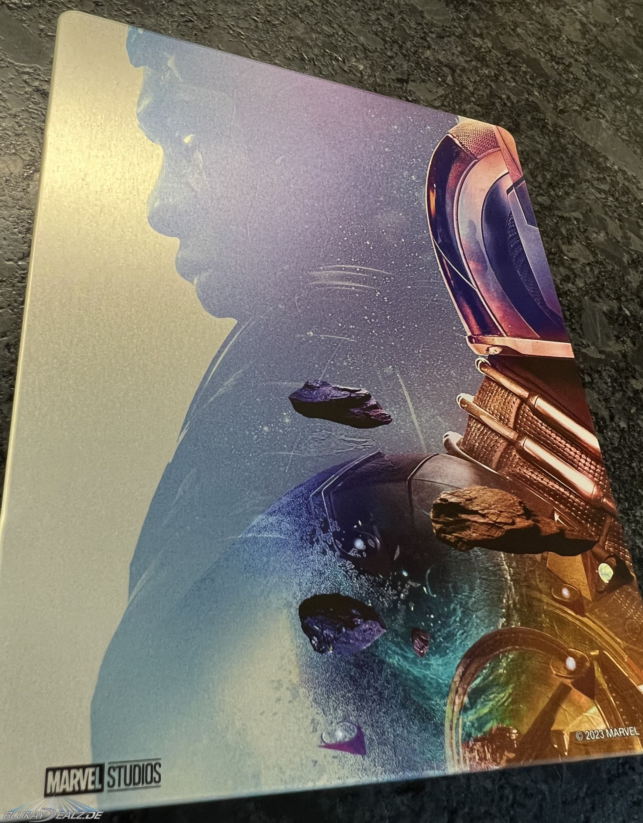Das Steelbook kommt erfreulicherweise mit einem stabilen ¼ Slip daher, oben umgeklappt und leider mit Popelkleber fixiert, bekommt man aber gut weg. Ansonsten schön, dass das stabile Slip beibehalten wurde, wie wir es ja aus der Vergangenheit kennen. Alle Infos zum Film sind darauf abgedruckt, daher eine textfreie Rückseite des Steelbooks bis auf zwei kleine Marvel Schriftzüge!