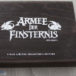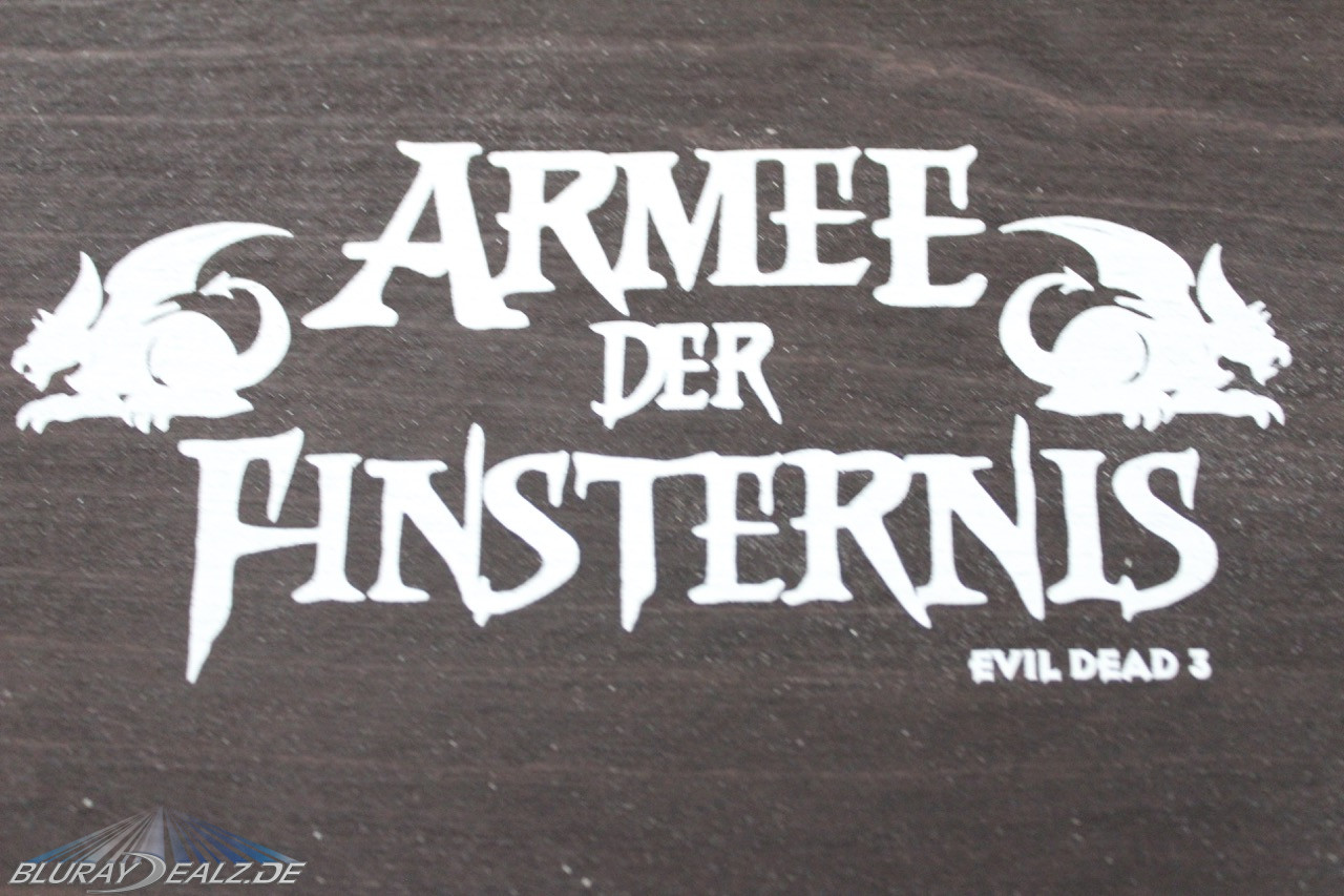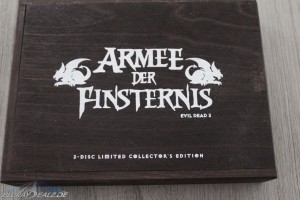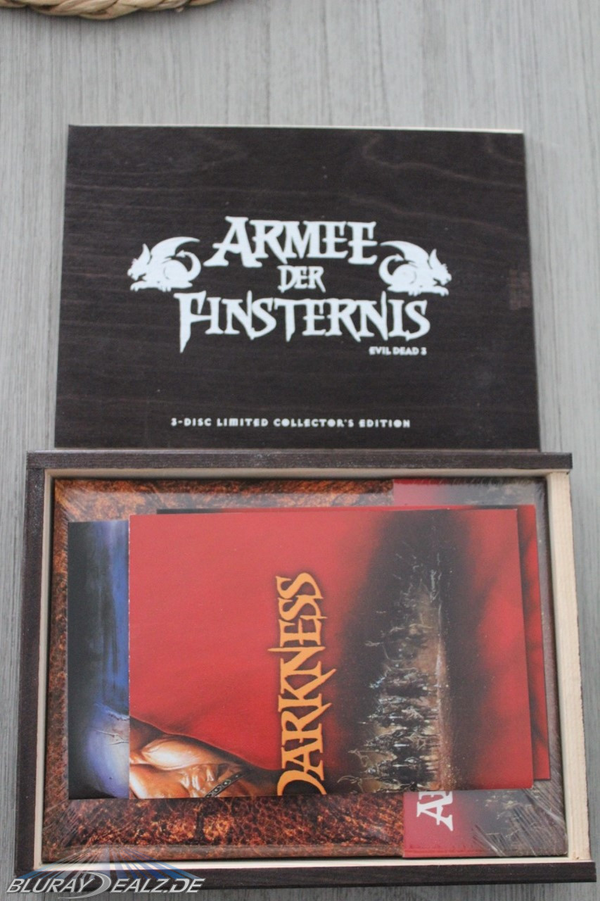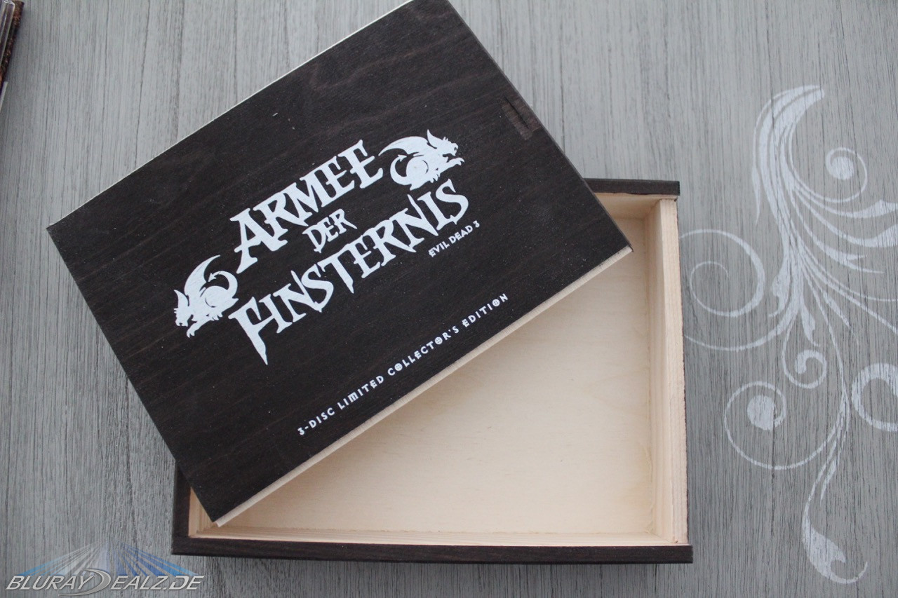 Die Edition besteht aus einer dunkelbraun gelaugten Holzbox. Diese ist 21,1 cm breit, 16 cm hoch und 3,9 cm tief. Auf dem Deckel ist in weiß der Filmtitel auf deutsch „Armee der Finsternis“ aufgemalt, rechts und links eingefasst von stilisierten geflügelten und gehörnten Dämonen. Darunter rechts findet sich der Untertitel „Evil Dead 3“, als Hinweis auf den dritten Teil der Tanz der Teufel Reihe. Ganz unten mittig findet sich die Bezeichnung der Collection „3-Disc Limited Collector`s Edition“.