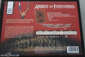 Drehen wir die Box um 180 Grad und schauen uns die Rückseite an finden wir ein mit einem Klebepunkt befestigtes Backpaper. Dort sticht einem gleich der Hinweis auf die Limitierung „Limited 1500 Edition“ ins Auge. Dann findet man die übliche Filminhaltsbeschreibung. In der rechten Spalte nochmal der Hinweis „Bruce Campbell im dritten Teil der Tanz der Teufel-Reihe von Kultregisseur „Sam Raimi“, darunter die Inhaltsübersicht der Box und die Filmcredits, sowie die Rechtehinweise und die EAN.