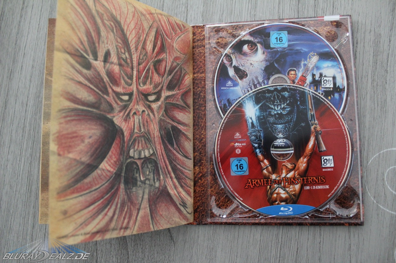 Als erstes Gimmick findet sich ein 2 Mal gefaltetes, doppelseitiges Filmplakat im DIN A4 Format. Auf der einen Seite sehen wir das mit rotem Hintergrund versehene Plakat, auf dem Ash die Kettensäge und die Schrotflinte empor reckt, darunter ist der Originaltitel „Army of Darkness“ zu lesen. Ganz unten sehen wir die titelgebene Armee. Oben Auf dem Plakat, auf dem Kopf stehend noch der Dämon. Auf der zweiten Seite sehen wir das deutsche Kinoplakat mit dem Titel „Armee der Finsternis“. Hier steht Ash mit zerissenem Hemd und der Kettensäge auf dem – auf der Seite liegenden – Zeitreise Cadillac, an seinem Bein kniend sehen wir Sheila. Vorne im Bild versuchen Soldaten der Armee der Finsternis auf das Auto zu gelangen. Hinter Ash sehen wir weitere Soldaten zu Pferd. Ganz im Hintergrund ist noch die Burg Henry des Roten zu sehen.