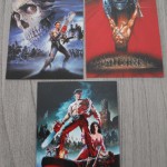 Unter dem Plakat finden sich drei Postkarten mit Hochglanzdruck auf der Front. Wie sehen die beiden bereits oben beschriebenen Motive, jedoch ohne Filmtitel. Als Drittes Motiv sehen wir Ash mit Kettensäge und doppelläufiger Schrotflinte vor der Armee der Finsternis, im Hintergrund erkennen wir die beleuchtete Burg, sowie passend zu den anderen Teilen der Reihe den Großen mit Augäpfeln bestückten Schädel.
