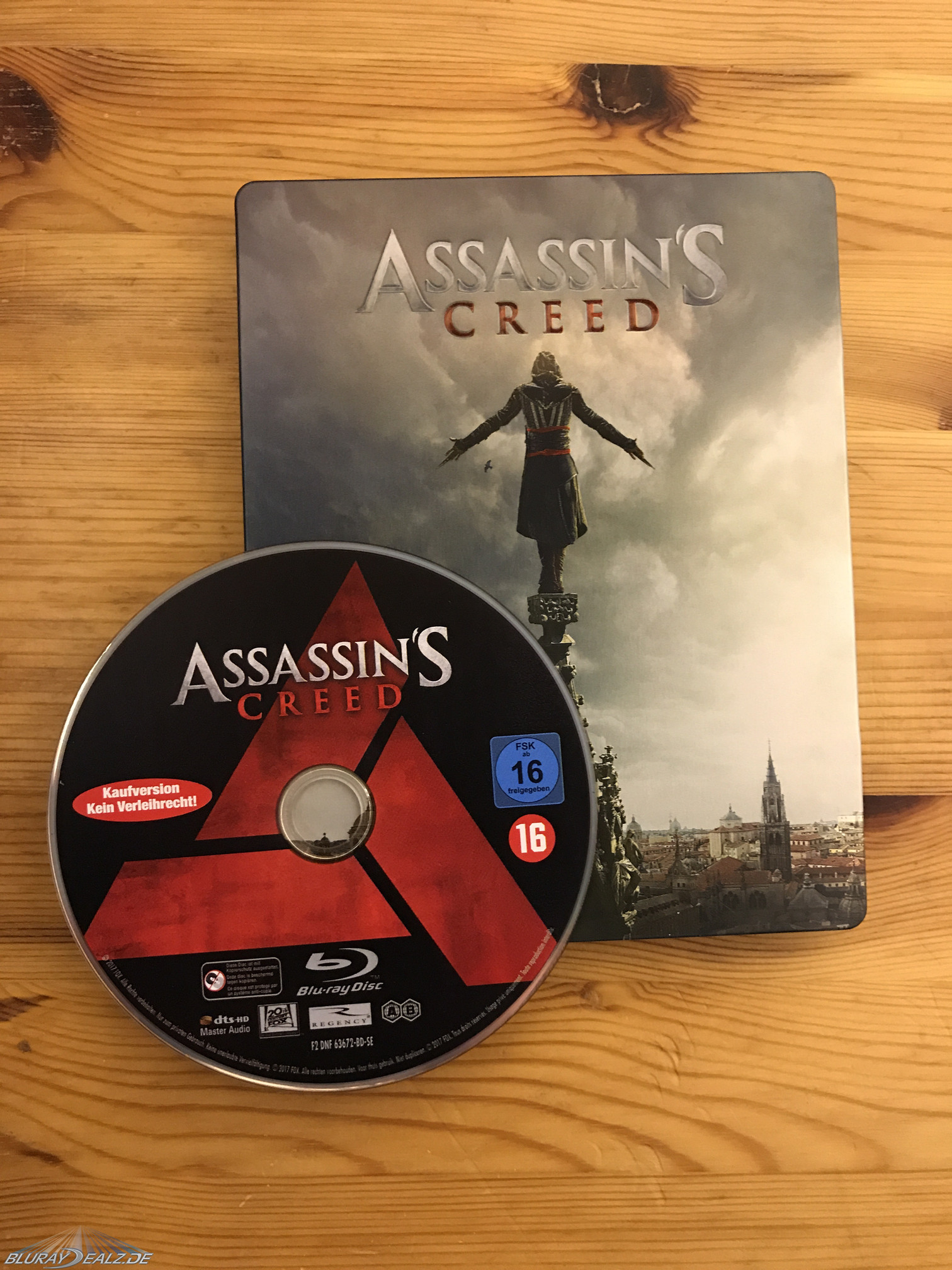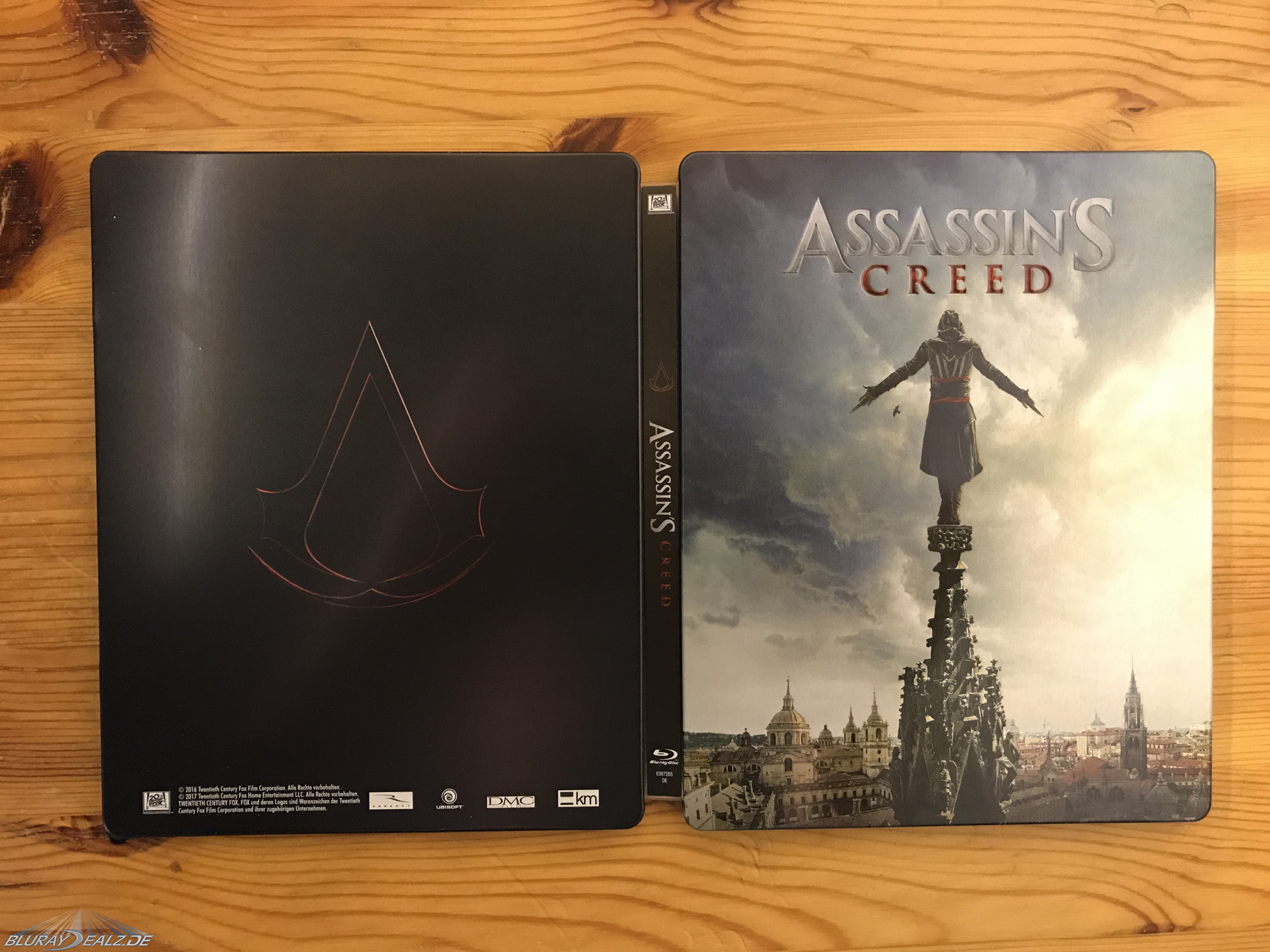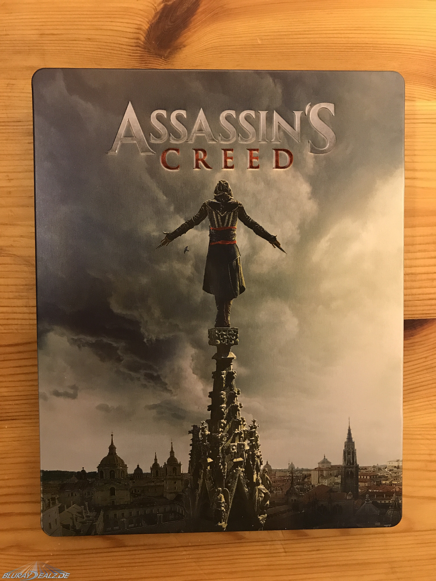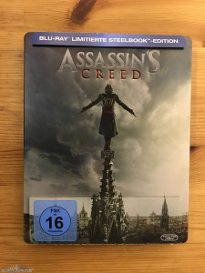 2017 erschien zum Film Assassin‘s Creed ein SteelBook von Fox mit einem glänzenden Cover mit dem Protagonisten Aguilar de Nerha auf einer Turmspitze – kurz vor dem Todessprung. Als Überschrift folgt das klassische Assassin’s Creed Logo, welches sogar geprägt ist.