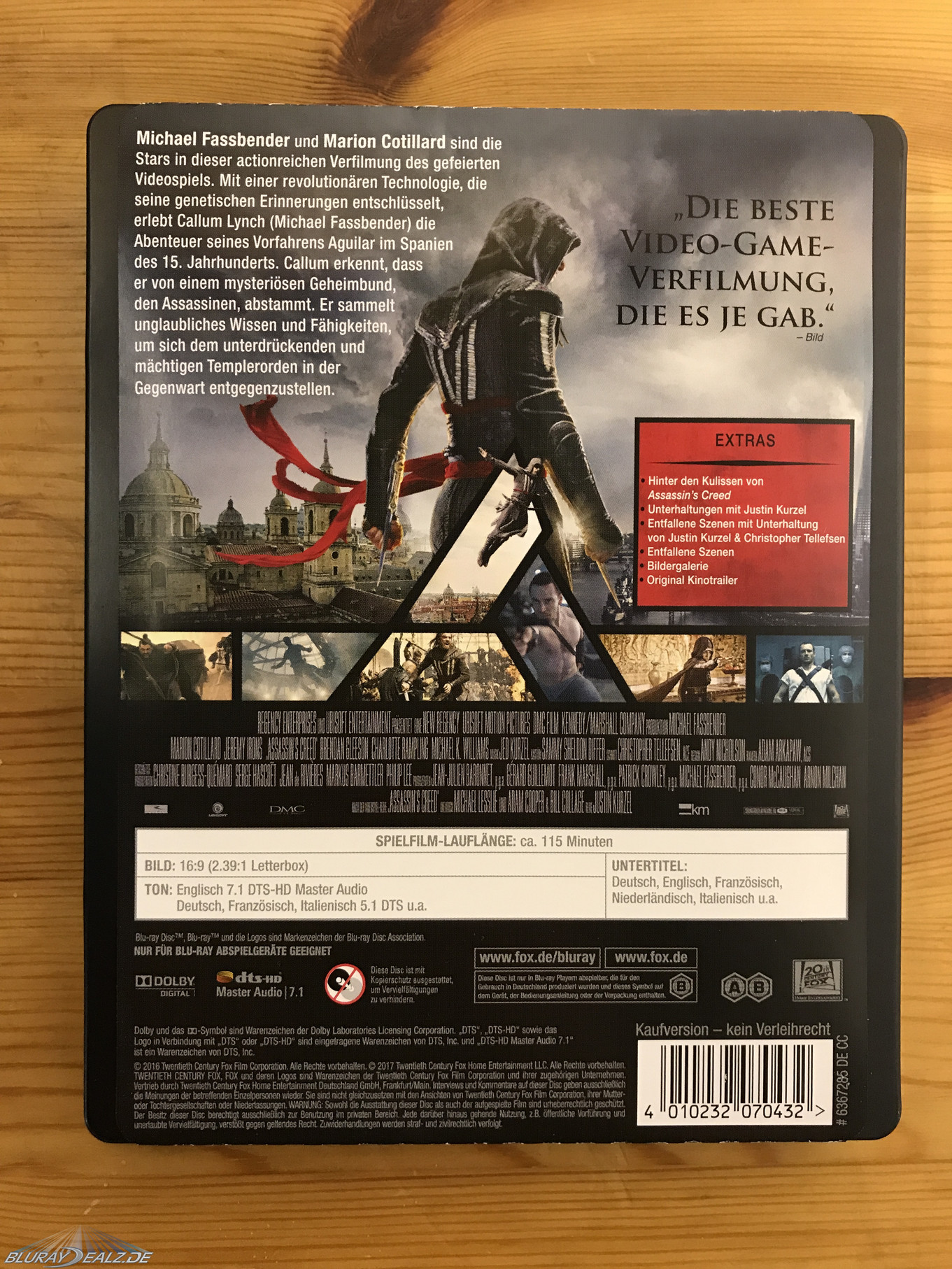 Persönlich empfinde ich das SteelBook als ein wirklich schönes Meisterwerk für SteelBooks. Mir gefällt der Gesamteindruck des SteelBooks wirklich sehr gut – besonders als Fan der Serie. Wer die Figuren aus Assassin´s Creed Packungen mag, kann sich auch welche dazu bestellen, eine Edition SteelBook und Figur gibt es aber leider nicht. Ich selbst als Fan der Serie überlege aktuell, mir auch eine Figur aus dem aktuellen Film zu schauen. Diese haben bis jetzt eine sehr gute Qualität bei den Spielen gehabt (siehe Extra-Foto). Der Film selbst ist für mich leider überhaupt kein Höhepunkt der Reihe. Die Spiele haben – verständlicher Weise – eine viel größere Tiefe und auch Story Inhalt, was in einem Film von knapp zwei Stunden einfach nicht möglich war. Auch finde ich es schade, dass man auf dem Träger es nicht schafft, einheitlich den Regionalcode zu schreiben – das Problem ist mir schon öfters aufgefallen.