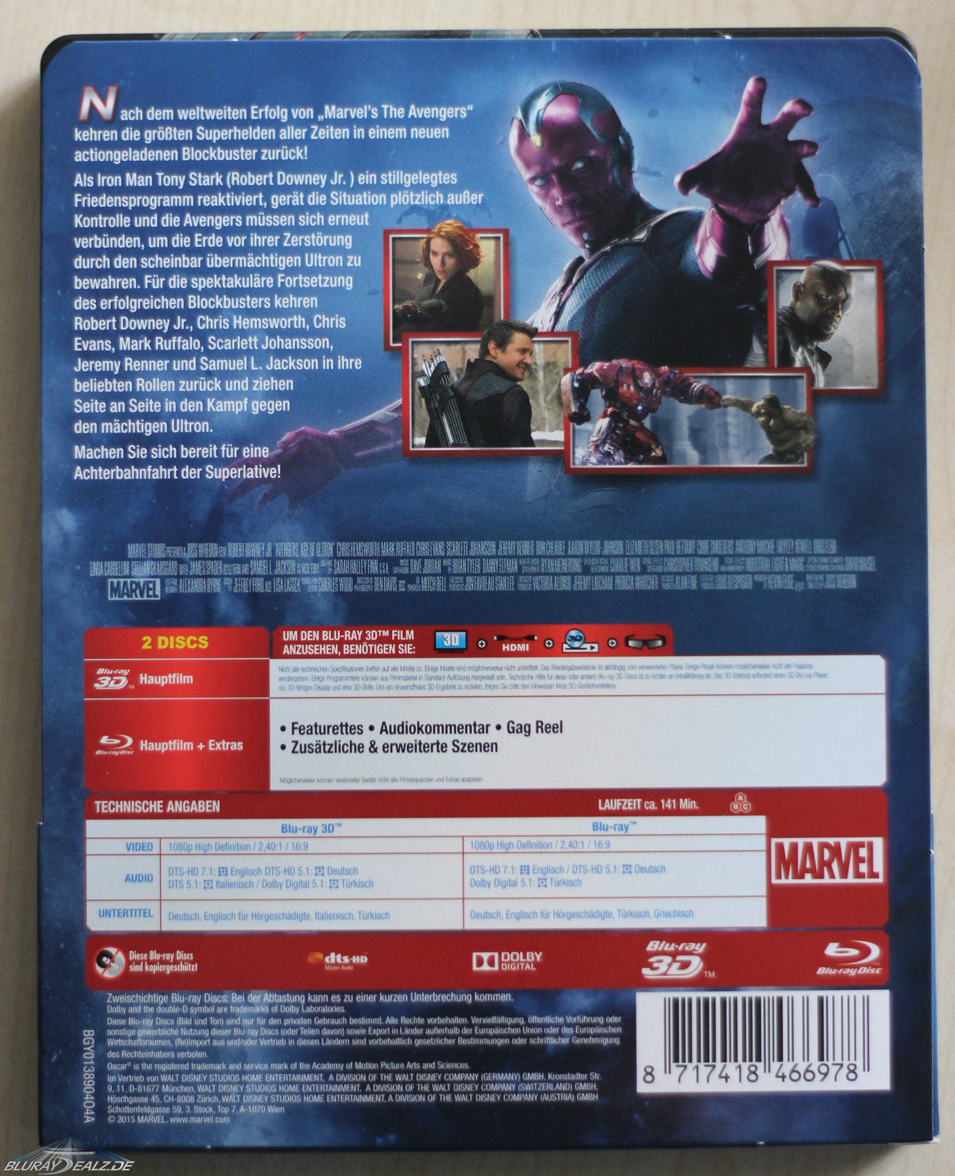 Extras: Featurettes (Making of Avengers: Age of Ultron, Die sechs Infinity Steine, Ein globales Abenteuer), Audiokommentar von Regisseur Joss Whedon, Gag Reel, Zusätzliche & erweiterte Szenen