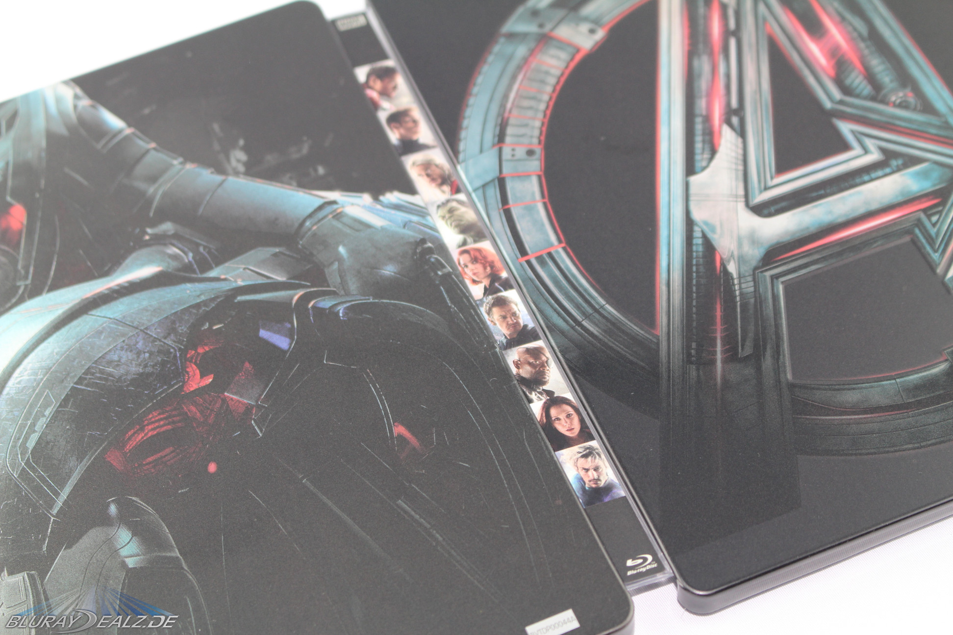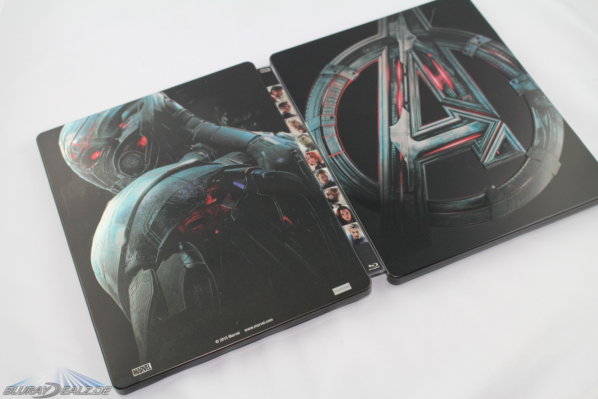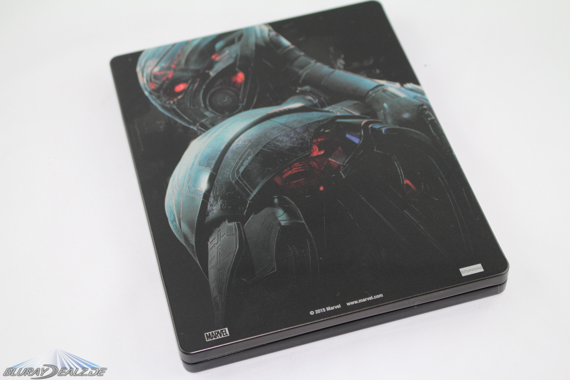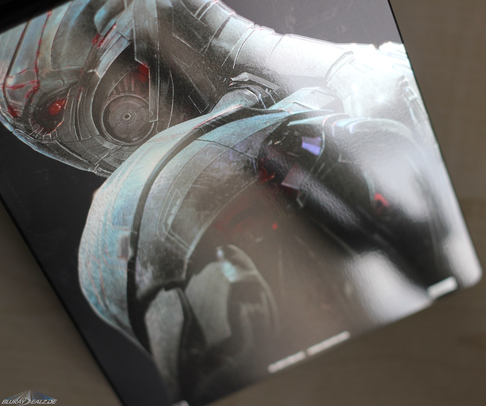 Während das deutsche Steelbook zum ersten Teil noch komplett in Hochglanz gehalten war, ist dieses nun matt mit Spotgloss-Artworks. Ein Nachteil ist dies keineswegs, da so und durch das intelligente Debossing, welches ein starkes Highlight ist, mehr Fokus auf das Artwork selbst gelegt wird, was ganz dem Film entspricht, der auch seinen Fokus mehr auf die Charaktere legte als noch im ersten Teil. Beide Male geht diese Rechnung auf und das Steelbook wirkt live extrem hochwertig und gerade das Backartwork von Ultron zieht den Betrachter in seinen Bann.