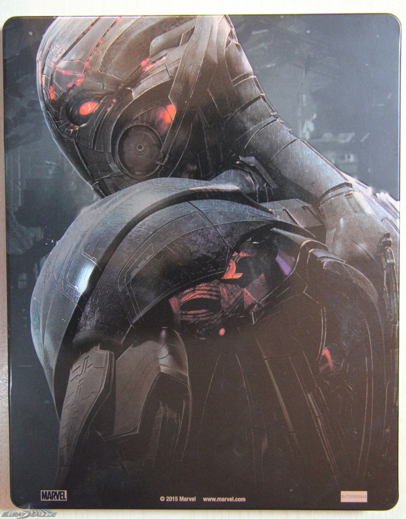 Das Backcover ziert ein über die Schulter blickender Ultron, der sich in einer Lagerhalle befindet. Erneut ist der komplette Körperbereich Ultrons in Hochglanz-Optik während der Hintergrund erneut matt gehalten ist. Auffällig ist, dass der Druck der Lagerhalle im matten Bereich des Backartworks verhältnismäßig schwach gedruckt wurde, was allerdings sehr gut im Zusammenspiel mit dem „Hochglanz-Ultron“ wirkt. Der Druck von Ultron ist extrem detailliert und sieht gerade bei Lichtreflektion super aus. Einzig störend sind die Disney/Marvel-üblichen Produktionsnummer und Studiologo am unteren Rand. Allerdings sind diese erfreulich klein gehalten.