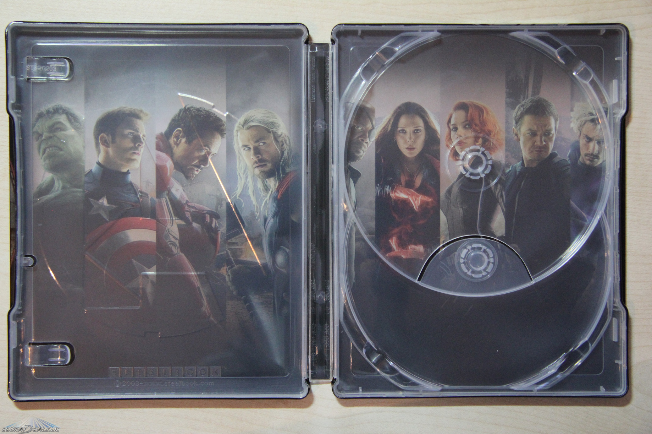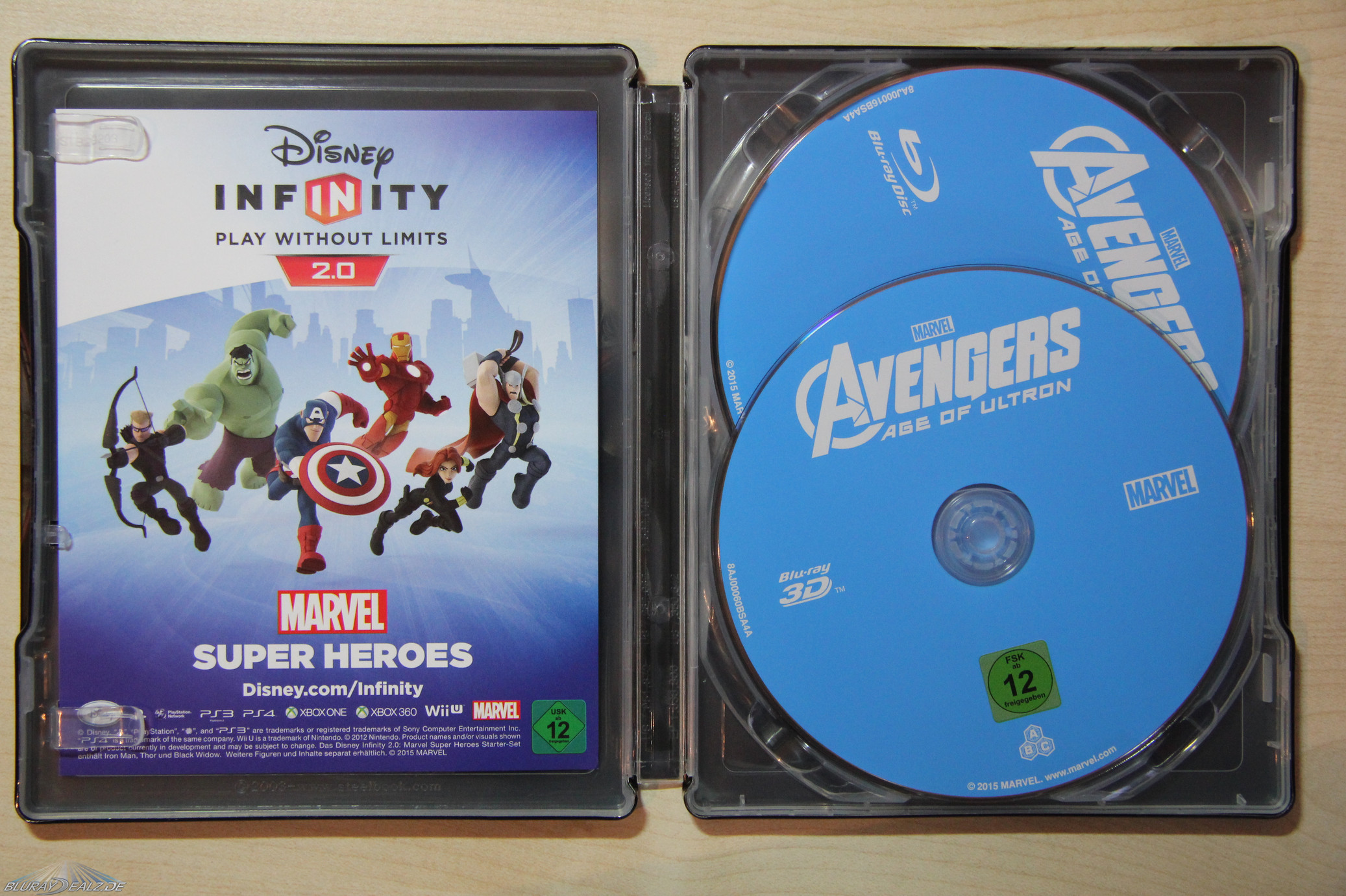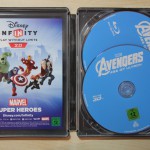 Öffnet man das Steelbook nun und nimmt den innen liegenden Werbeflyer für „Disney Infinity 2.0“ heraus, so erwartet einen ein extrem farbkräftiger Innendruck, welcher die bereits auf den Spine vertretenen Avengers zeigt. Der Druck ist zudem sehr detailliert und ein weiteres Highlight des Steelbooks.