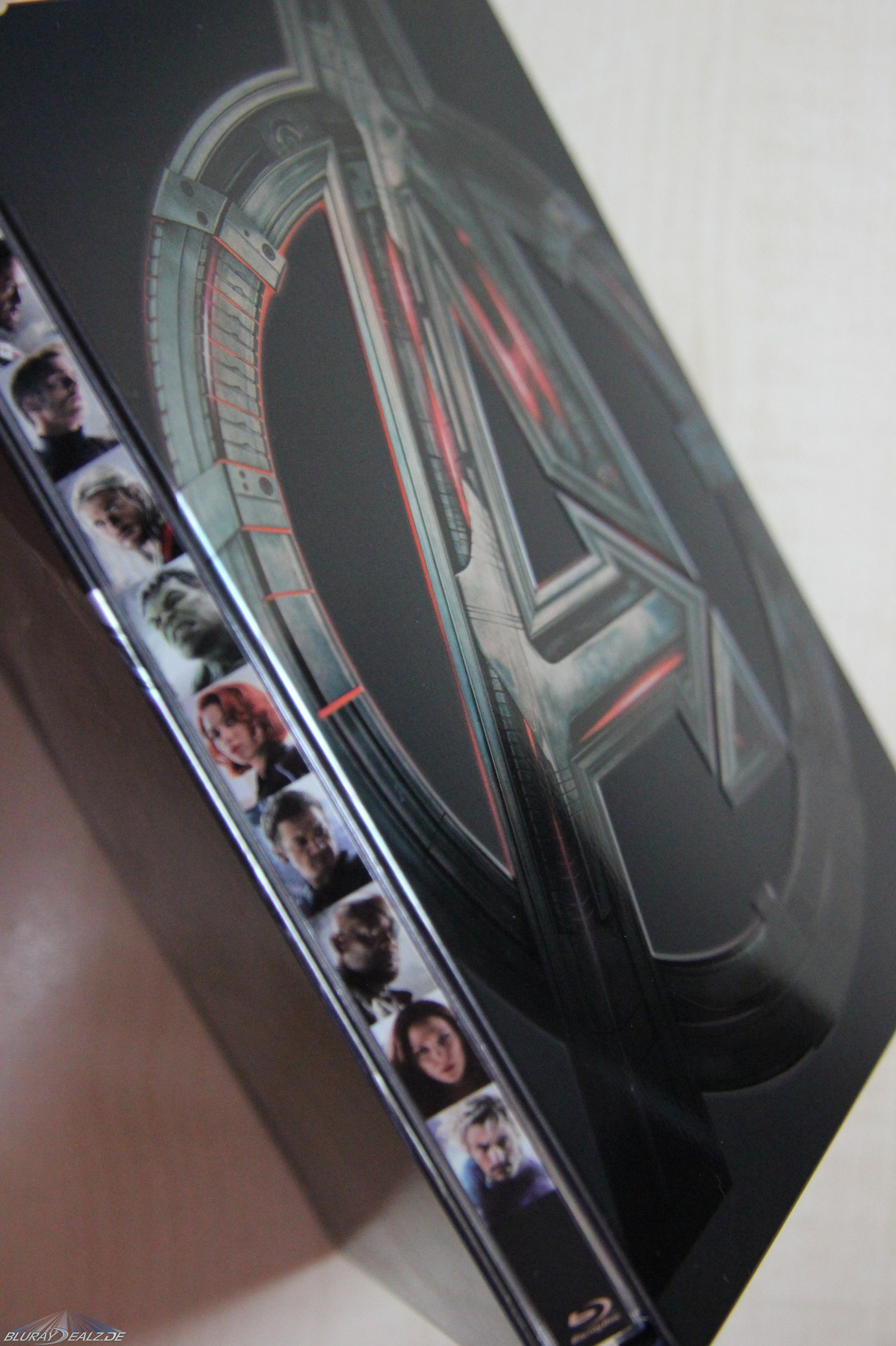 Das Spine ist ebenfalls Marvel-üblich titellos, allerdings sollte jedem Filmgucker dank der stattdessen verwendeten und auch mit Glanzdruck versehenen Charakterporträts sofort klar sein um welchen Film es sich handelt. Abgebildet sind neben dem Marvel- und Blu-ray-Disc-Logo von oben nach unten: Iron Man, Captain America, Thor, Hulk, Black Widow, Hawkeye, Nick Fury, Scarlet Witch, Quicksilver.