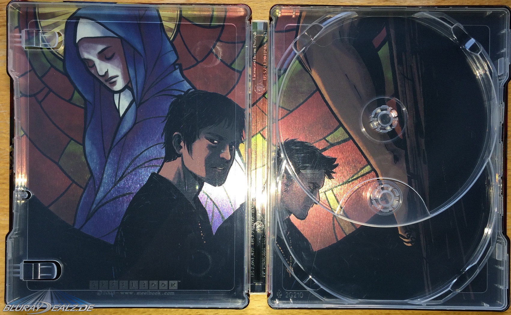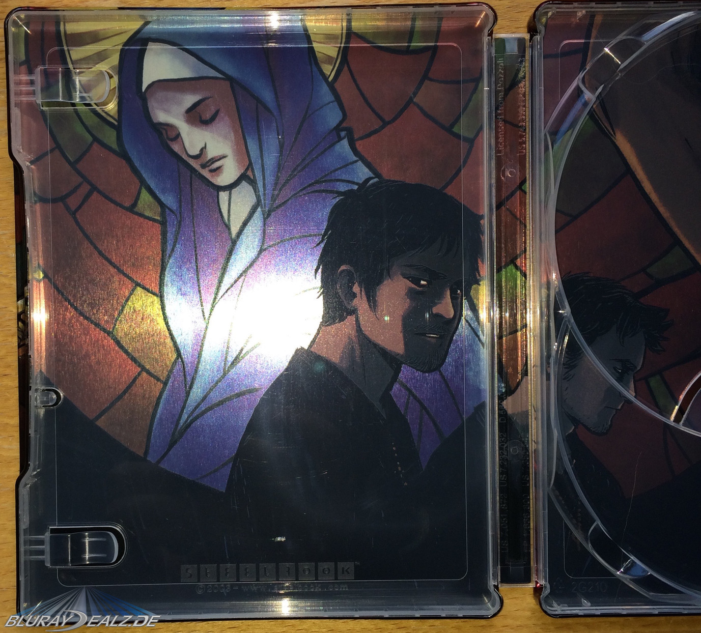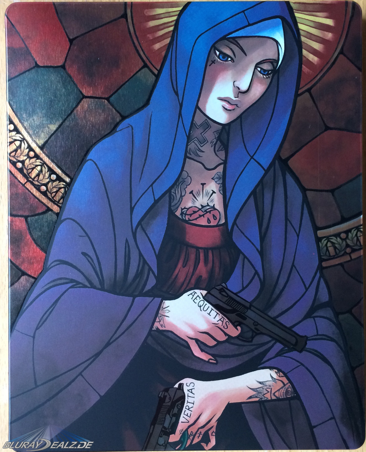 Die Front des Steelbooks, wie auch das restliche Steelbook, ist in sehr kräftigen Farben gestaltet. Es zeigt eine Variante der heiligen Maria, in der Stilisierung der Boondock Saints. Sie hält zwei Pistolen in den Händen. Diese heben sich als Glossy-Elemente vom Untergrund ab. Die Figur ist vor einem mosaikartigen Kirchenfenster positioniert und ist von einem Heiligenschein gekrönt.