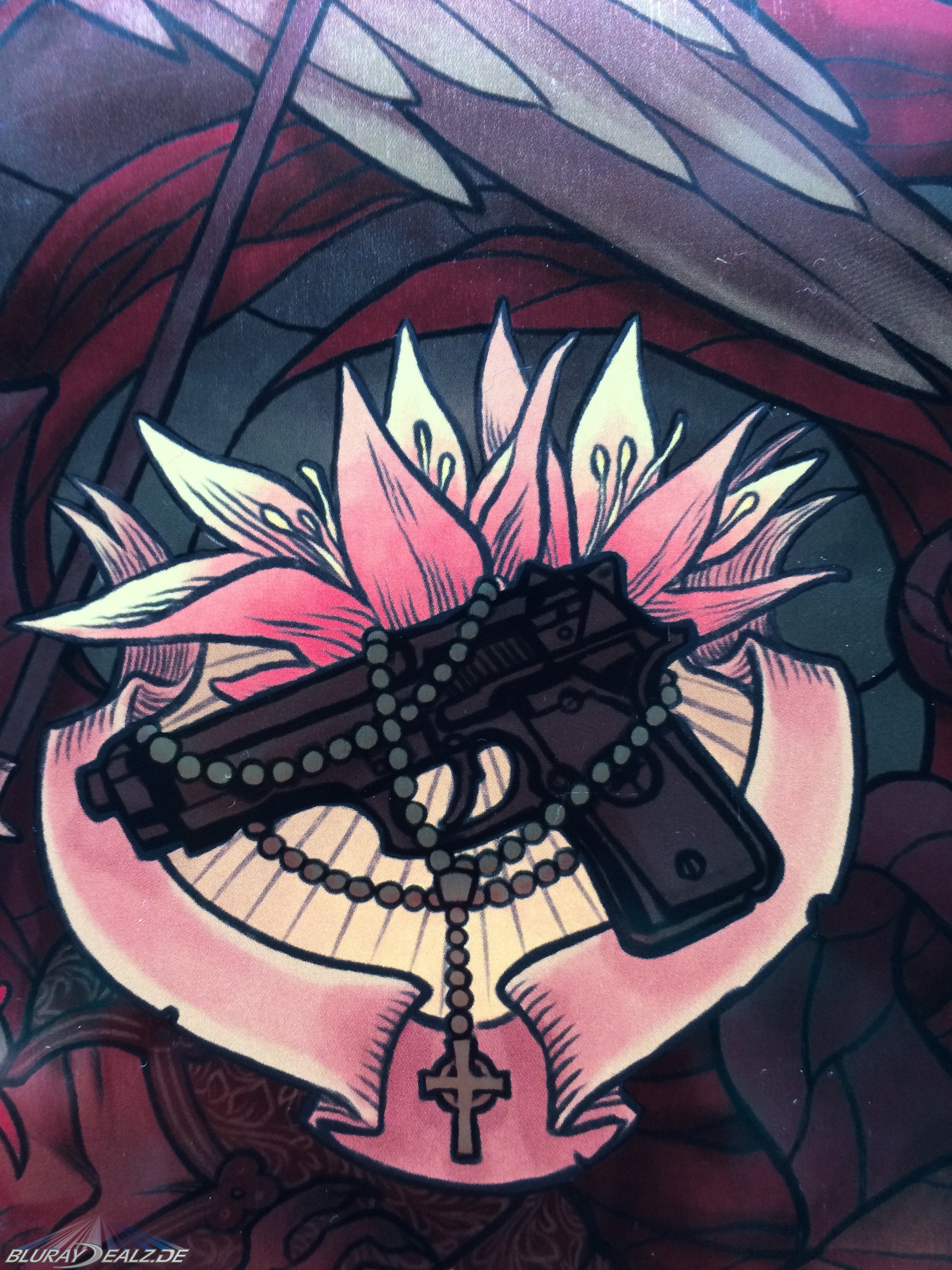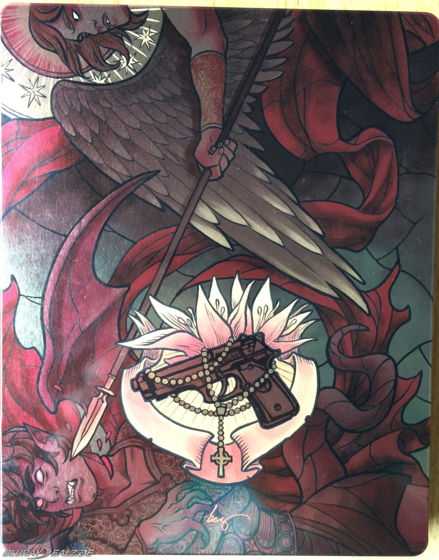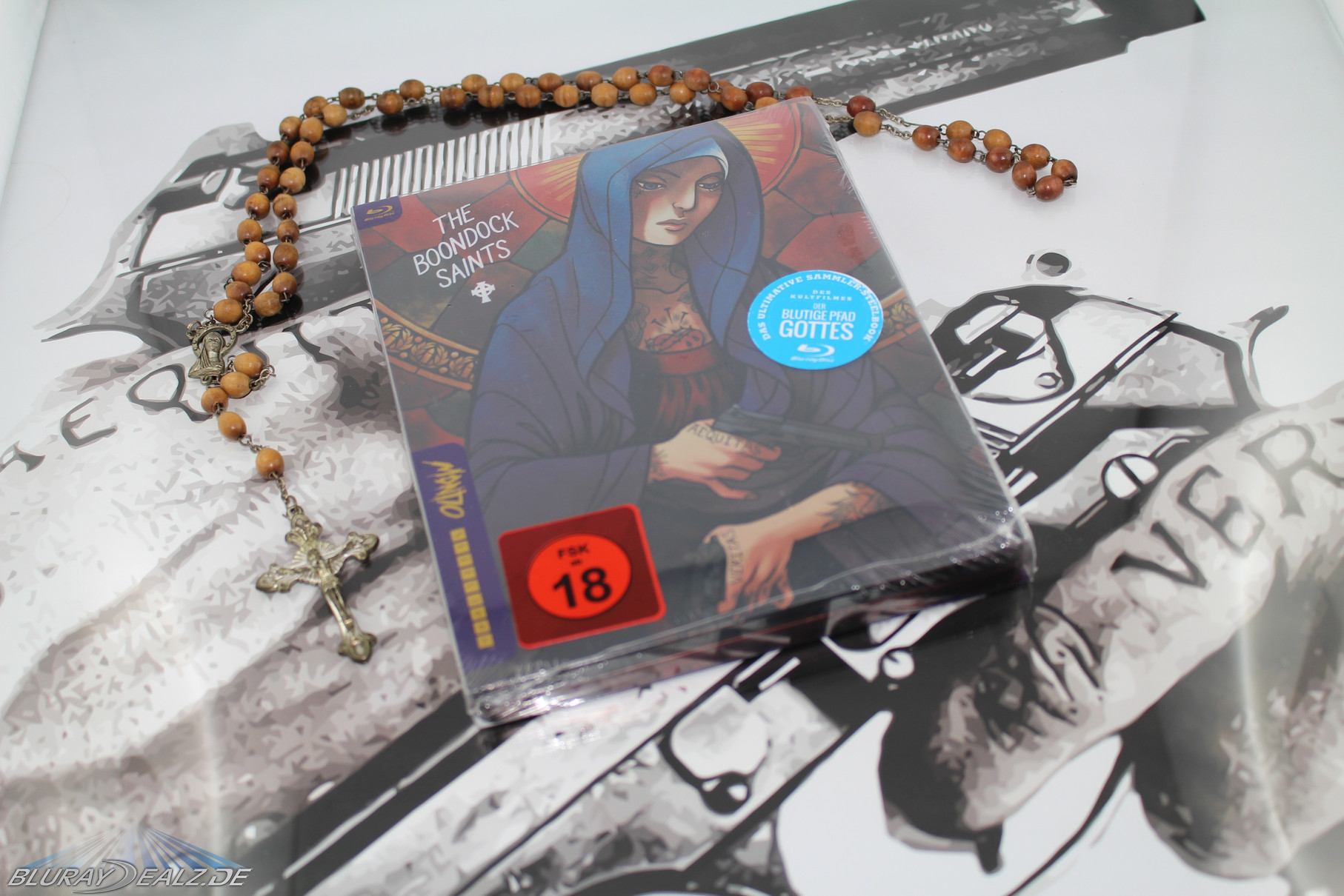 Die Front des Steelbooks, wie auch das restliche Steelbook, ist in sehr kräftigen Farben gestaltet. Es zeigt eine Variante der heiligen Maria, in der Stilisierung der Boondock Saints. Sie hält zwei Pistolen in den Händen. Diese heben sich als Glossy-Elemente vom Untergrund ab. Die Figur ist vor einem mosaikartigen Kirchenfenster positioniert und ist von einem Heiligenschein gekrönt.