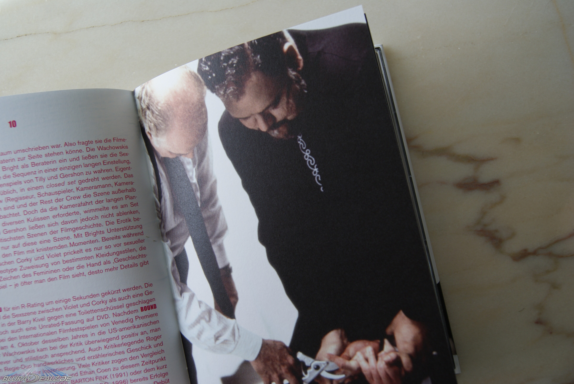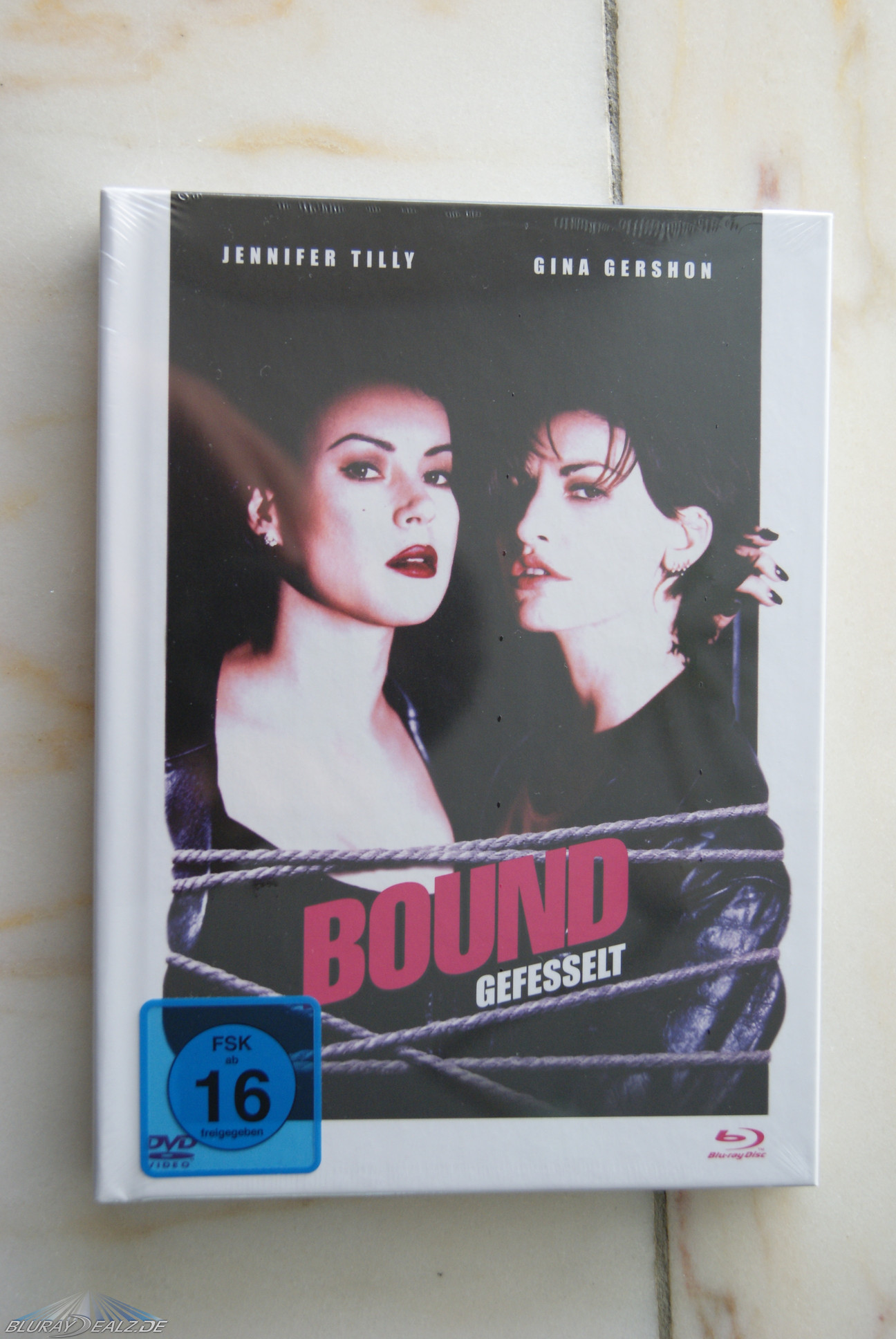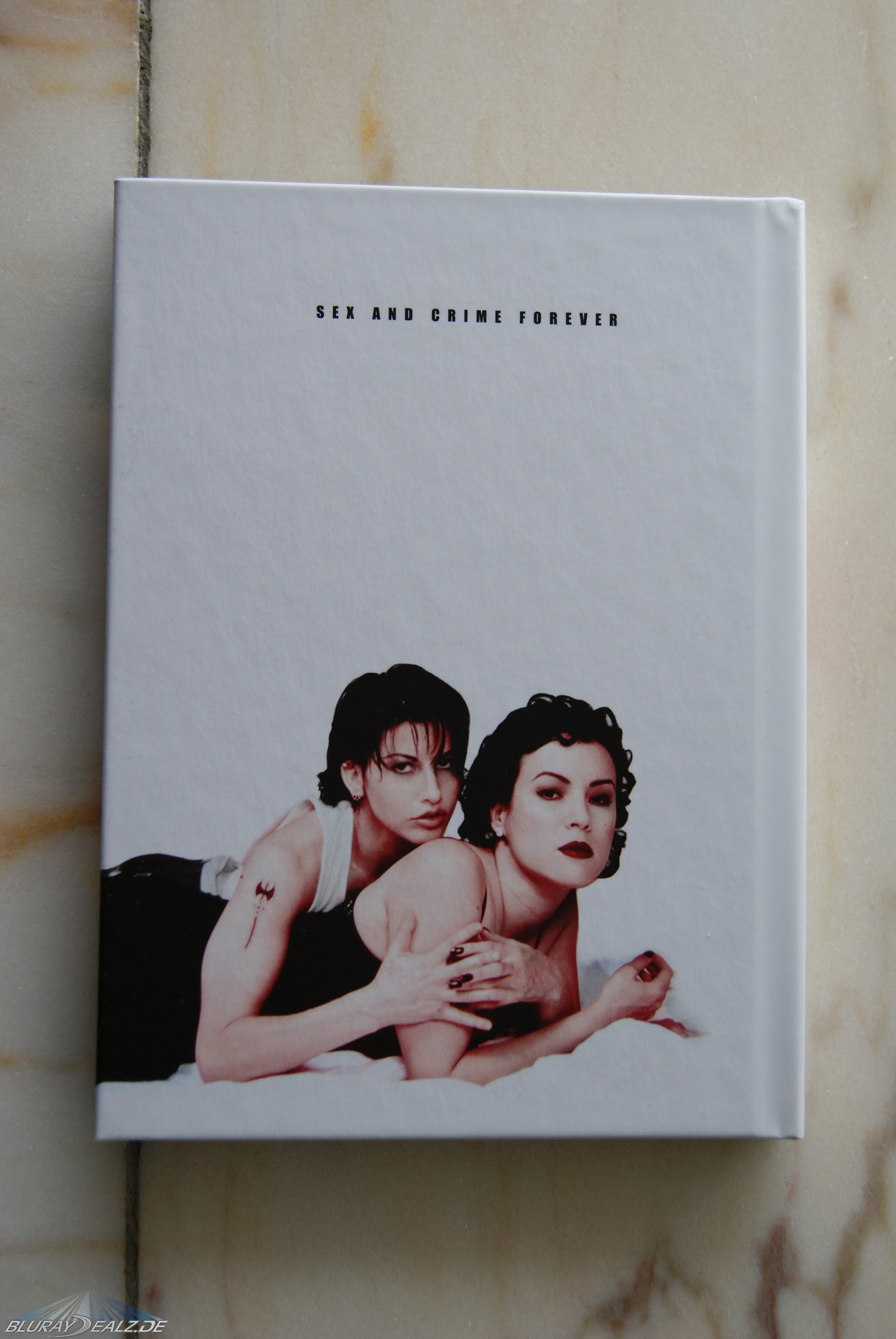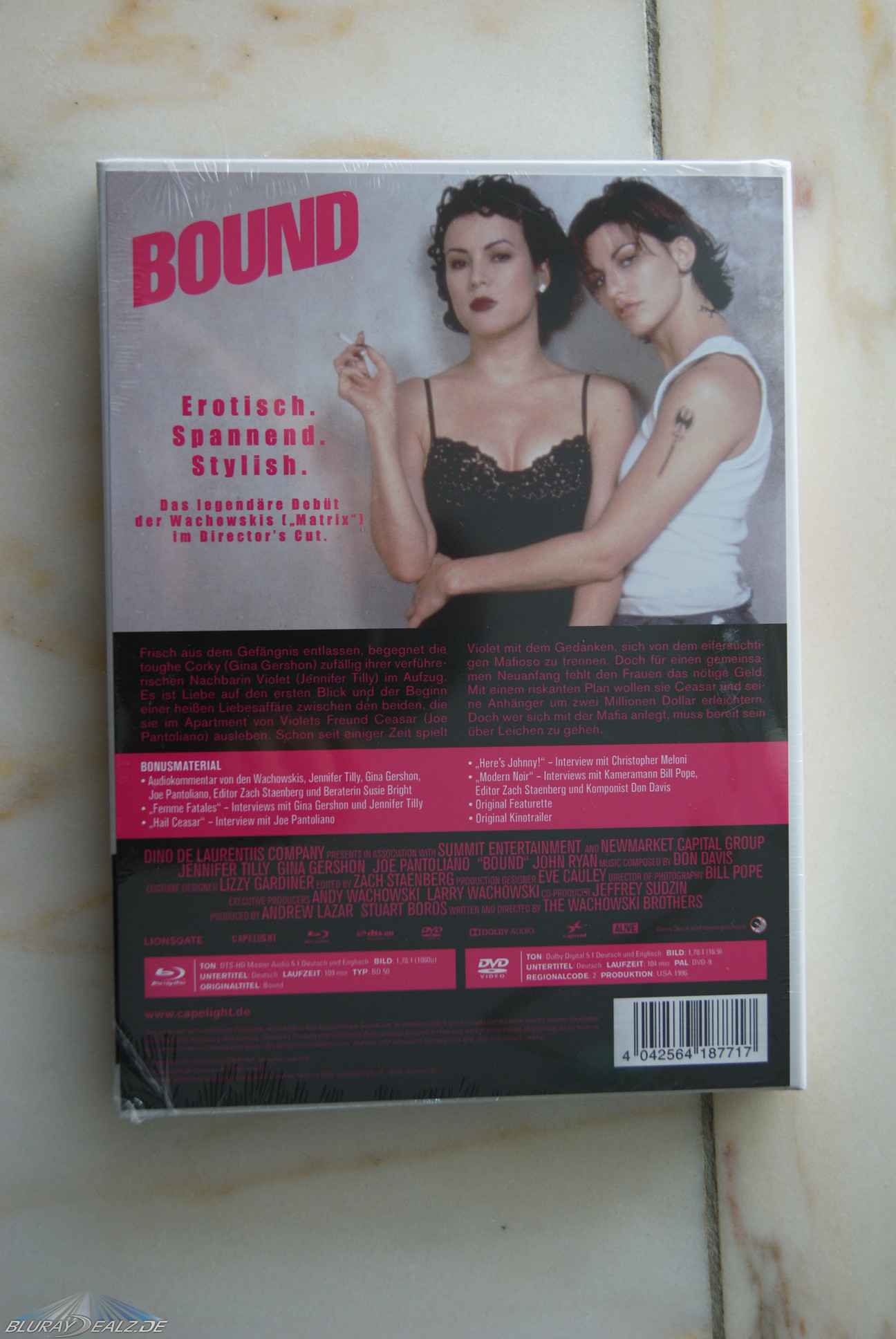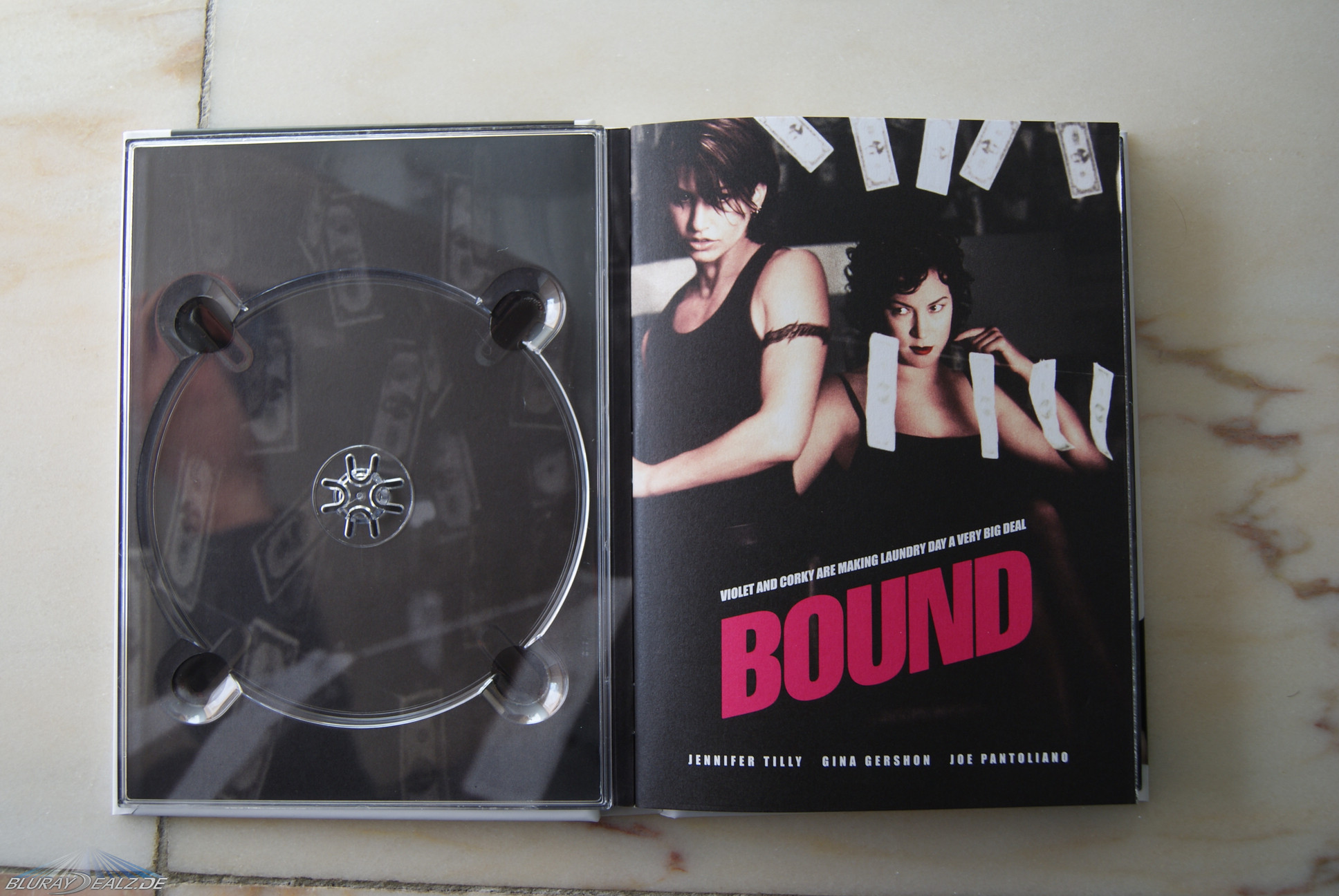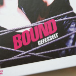 Die Vorderseite zeigt das bekannte Motiv des Filmes, dieses ist allerdings etwas in weißen Balken eingerückt. Dadurch wird das Motiv leider etwas verkleinert. Positiv herauszustellen ist, dass der Titel Bound in Spotgloss gedruckt ist – schick !