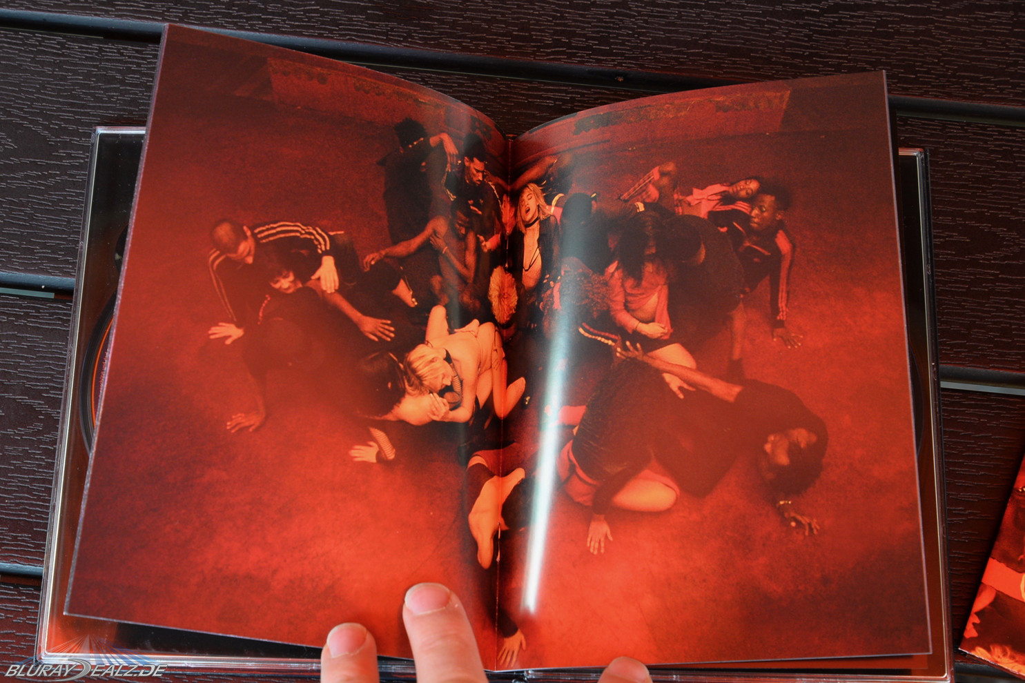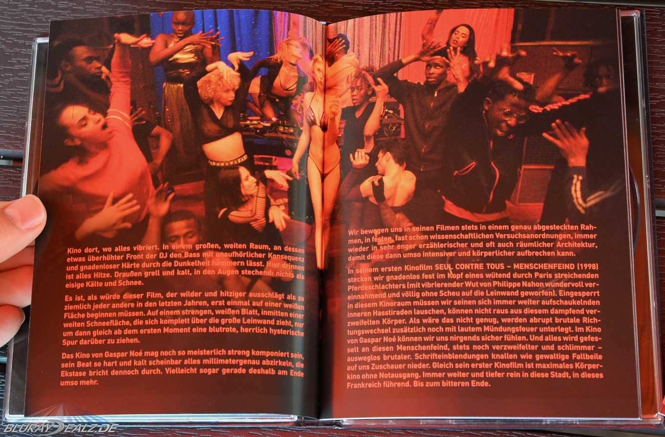 Wunderbar. So würde ich das Mediabook mit einem Wort beschreiben. Alles an diesem Mediabook finde ich gelungen. Das erste was auffällt, wenn man es in die Hand nimmt, ist das Gefühl etwas wertiges, festes in der Hand zu halten. Es ist aus sehr stabilem Karton gemacht, der durch ein glänzendes Finish veredelt wurde. Es ist nicht zu dick und passt zu anderen Mediabooks wie z.B. den Capelights. Schön, dass die elend dicken Trays von Koch nicht verwendet wurden. Also, eine sehr tolle Haptik. Der Rücken ist schön zentriert. Das Cover ist absolut stimmig mit einem tollen Motiv, toll eingearbeitetem Titel und einem kräftigen Ton. Gelungen! Die Rückseite ist dagegen ein Reinfall. Ich hasse es, wenn die Rückseite vollgeschrieben ist. Die Meinungen mögen da unterschiedlich sein. Wenn das Bild der Rückseite formatfüllend wäre, wäre es eine Augenweide gewesen. Dafür liegt das Bild dem Mediabook als Poster bei. Also haben wir damit ein zusätzlichen Bonus: das Poster. Völlig unsinnig. Wer hängt sich ein gefaltetes Poster an die Wand? Bravo-Zeiten lassen grüßen. Viel wichtiger ist das enthaltene Mediabook. Und das ist extrem gut geworden. Die Bilder sind passend ausgesucht. Der Text ist üppig und sogar sehr gut. Enthalten ist ein Essay von Sebastian Selig, der sich extrem gut und informativ liest. Danach folgt noch ein Interview mit Gaspar Noe. Was möchte man mehr? Die enthaltene Blu-ray und DVD sind unterschiedlich bedruckt. Das Motiv der Discs wiederholt sich unter den Discs. Da hätte man etwas kreativer sein können.