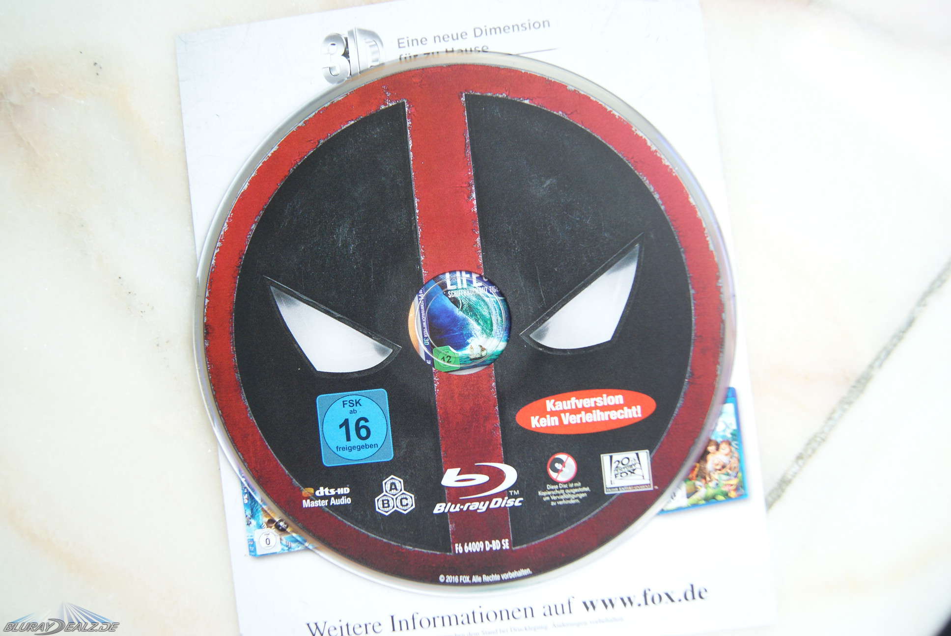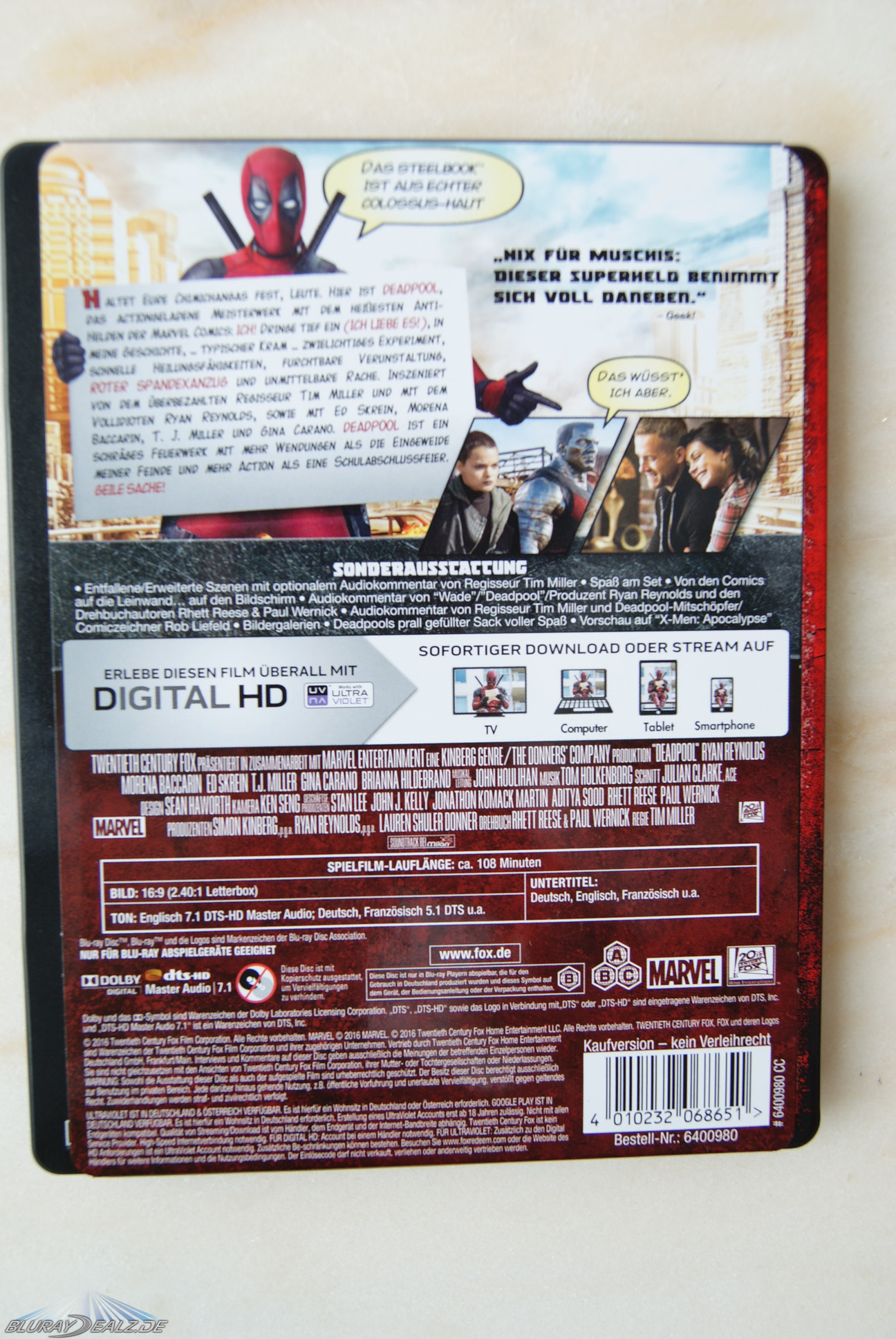 Tja, hier fängt es schon an. Die J-Card ist ja geradezu fast genauso anarchisch wie Deadpool selbst. Sie lappt oben und unten über – soweit so normal – allerdings ist auf der oberen linken Seite eine „Erweiterung“ der J-Card mit einem Bild von Deadpool selbst und seiner Anmerkung: „Limiertes Steelbook! So hart und geil wie ich.“ Auf der Rückseite verspricht er zudem noch, dass das Steel aus echter Colossus-Haut gemacht ist, was dieser wiederum bezweifelt. Auch die Worte zum Film sind in Deadpools Worten gehalten, was diese entsprechend unterhaltsamer machen als auf jeder normalen J-Card. Als netten Bonus dazu noch: Die J-Card passt von der Breite her später schön in das Steelbook!