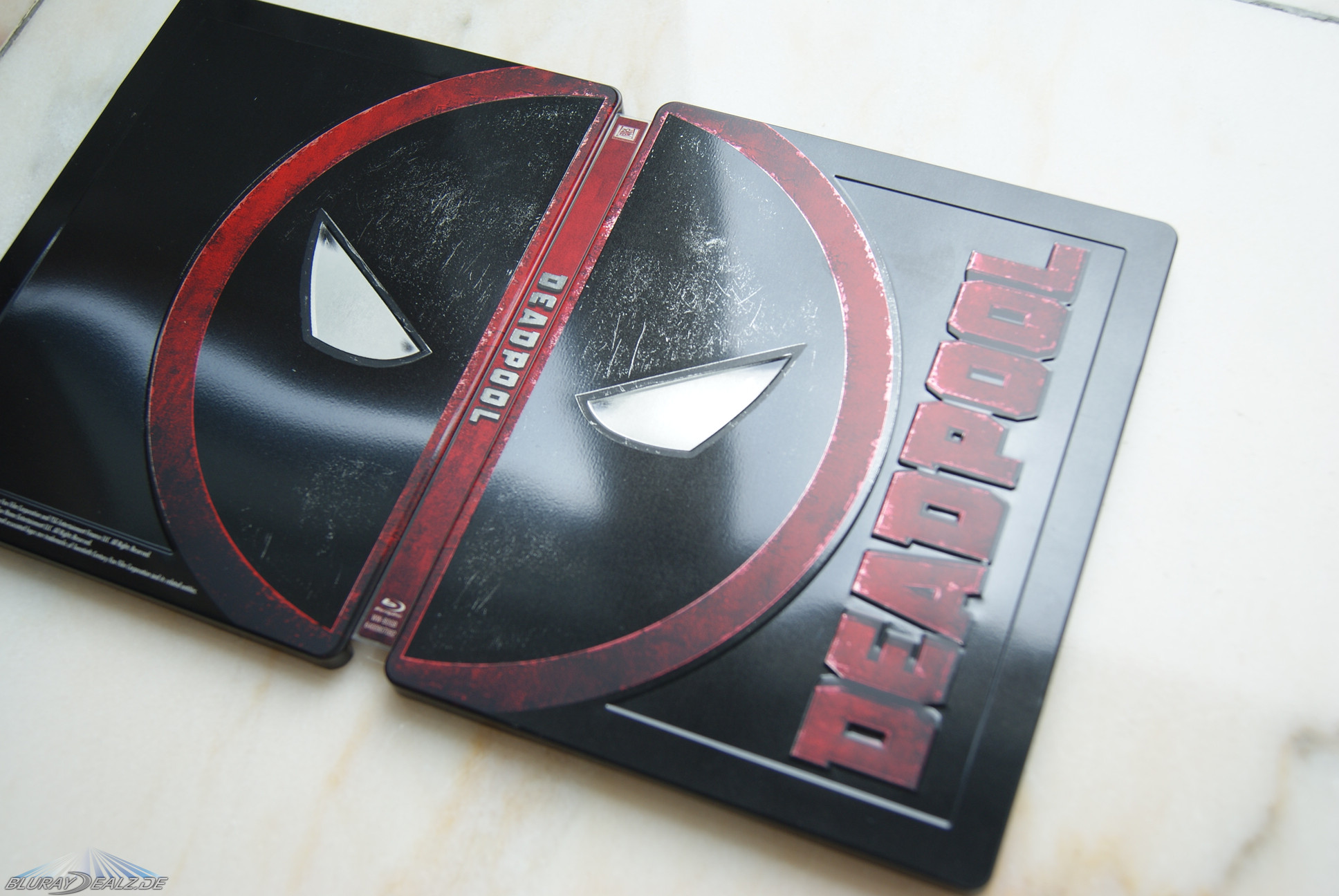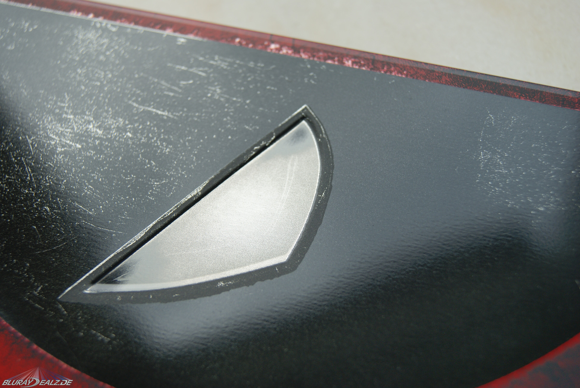 Die Schrift auf dem Spine geht von oben nach unten, die gewählte Farbe ist Deadpool-Rot. Klappt man das Steel jetzt einmal komplett auf, ergänzt der Spine das Gesamtbild perfekt und man sieht das komplette Deadpool-Symbol in voller Größe. Ein wahrer Augenöffner. Wunderbar. Genial. Deadpoolös!