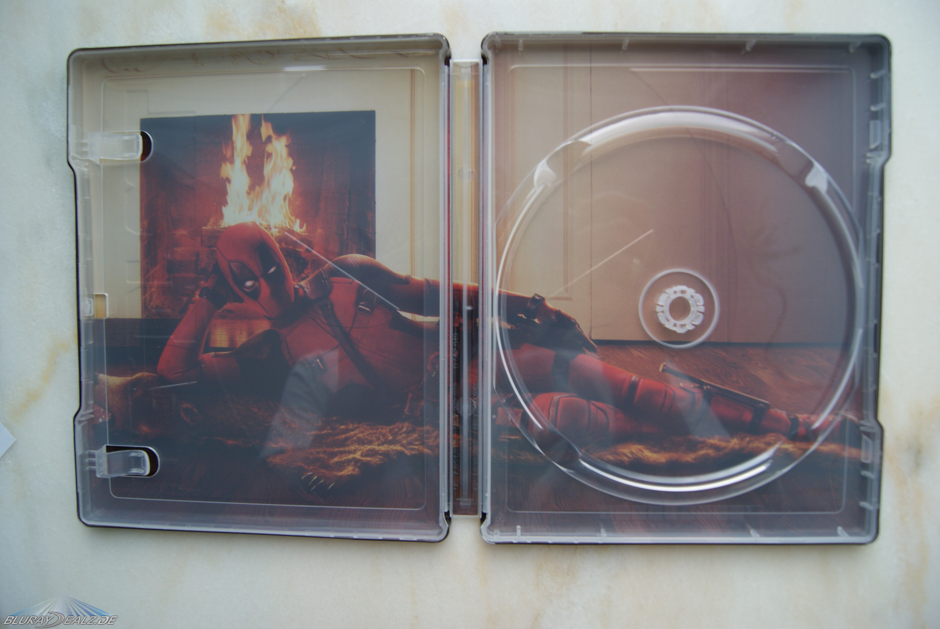 Auf der linken Seite befinden sich zwei Infoflyer (Ultraviolet und eine Werbung zum Deadpool-Comic), auf der rechten Seite ist die Disc – die komplett mit dem Deadpool-Zeichen bedruckt ist (sieht natürlich wieder sehr passend aus). Entfernt man all dies, sieht man den guten Deadpool in seiner vollen Pracht auf einem Bärenfell vor einem Kamin liegend. Ich bin mir noch nicht ganz sicher, wie ich das Steel jetzt so geöffnet in meinen Spind kriege :lol: . Aufgrund des Motivs kann der Druck natürlich nur scharf sein.