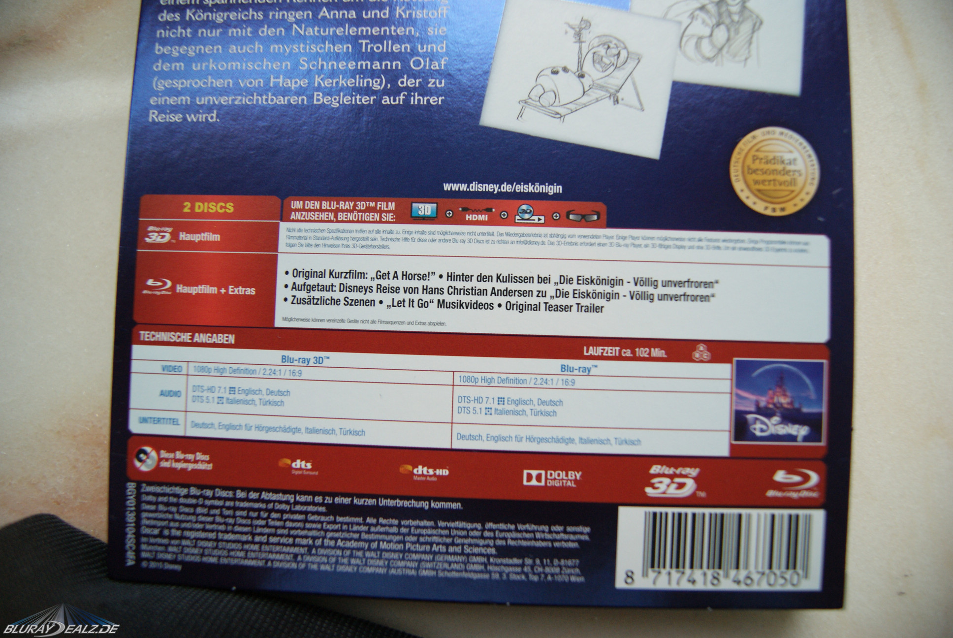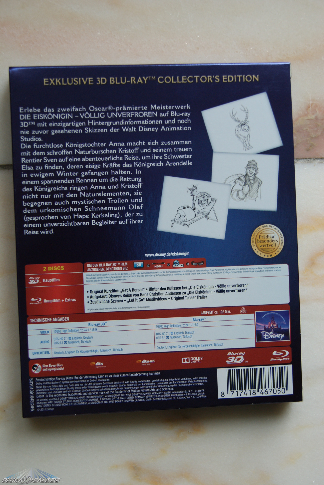 Alles in allem fällt mein Urteil über diese Edition eher positiv aus, allerdings ist man von Perfektion noch weit entfernt. Der Höhepunkt sind sicherlich die tollen Zeichnungen im Inneren und auf den beiden Frontcovern (Schuber und Digibook), wobei das auf dem Schuber mit den diversen Glanzeffekten in den Details noch weiter heraussticht. Auch die Verarbeitung und der informative Text des Booklets sind positiv zu erwähnen. Auf der anderen Seite fällt die etwas lieblose Gestaltung der Rückseiten – sowohl Digibook und Schuber – auf. Da wäre deutlich mehr drin gewesen. Mein größter Aufreger – aber wahrscheinlich war da mit nichts anderem zu rechnen – ist allerdings, dass es sich um exakt die gleichen Discs wie aus der bekannten, normalen Veröffentlichung aus 2014 handelt. Wie sehr hätte es sich doch angeboten einige weitere Extras dazu zu packen, wie z.B. das bei der ersten Veröffentlichung kurzzeitig gestrichene lange Making-Of, den Kurzfilm „Die Eiskönigin – Party-Fieber“ oder eine Vorschau auf die für 2016 angekündigte Fortsetzung zu „Die Eiskönigin“.