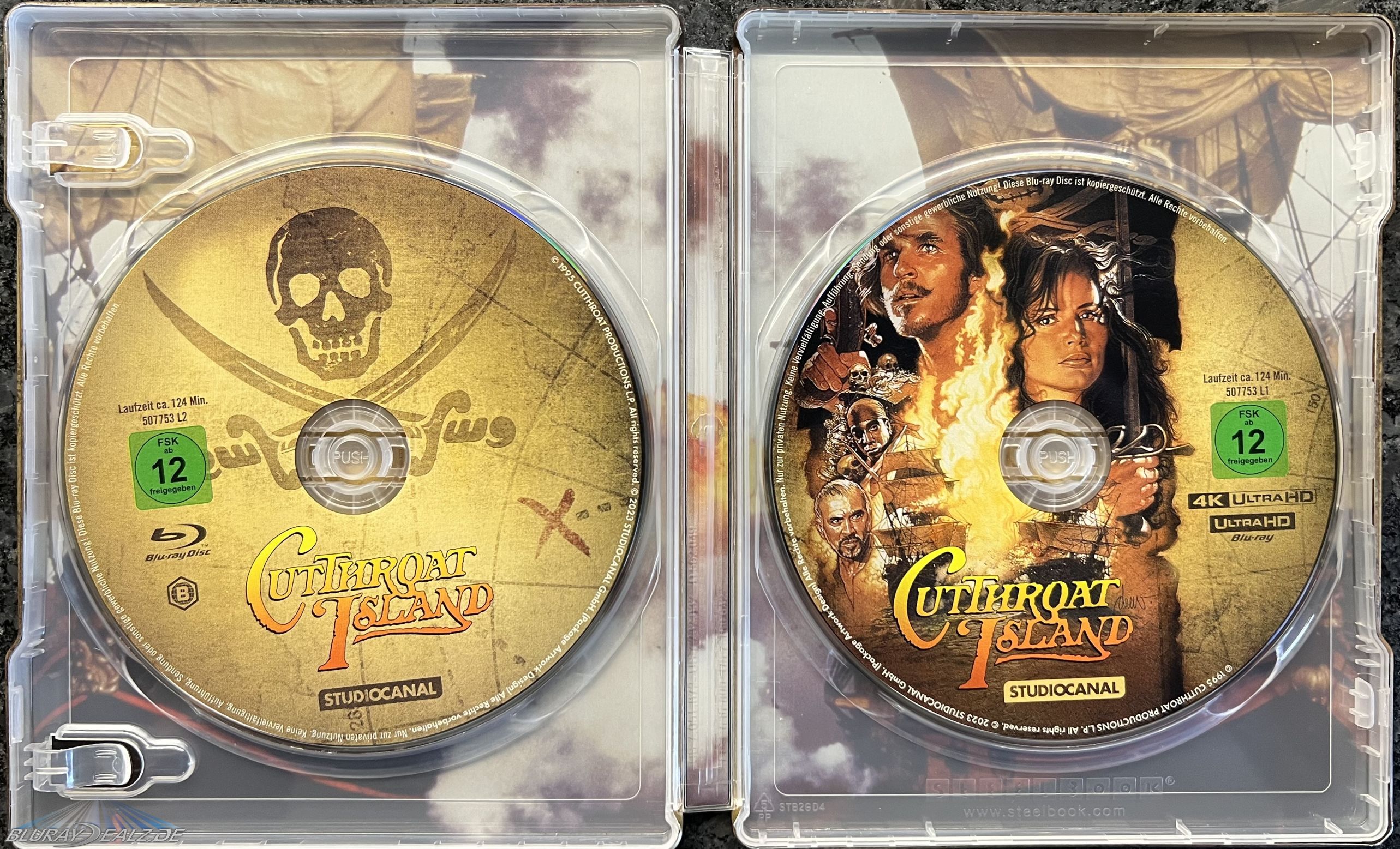 Nach dem Entfernen von Folie und Slip halten wir das Steel in den Händen, gänzlich in matt gehalten mit minimalsten Spoteffekten, und stellen erfreut fest, dass wir seit Ewigkeiten (ich persönlich kann mich kaum an das letzte Mal erinnern) eine Prägung, in diesem Falle Tiefenprägung, präsentiert bekommen. Der Titel, dieses Mal im Original „Cutthroat Island“ ist tiefengeprägt und sehr schön gehalten. Ansonsten ist die Front geziert mit dem bekannten Motiv des Kinoplakats welches auch schon bei (fast) allen anderen VÖs zur Verwendung kam. Der Druck ist super scharf und macht einen tollen Eindruck. Im Hintergrund ist eine Schatzkartenoptik gestaltet,….