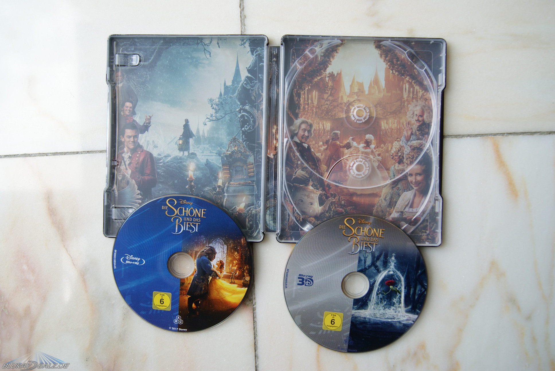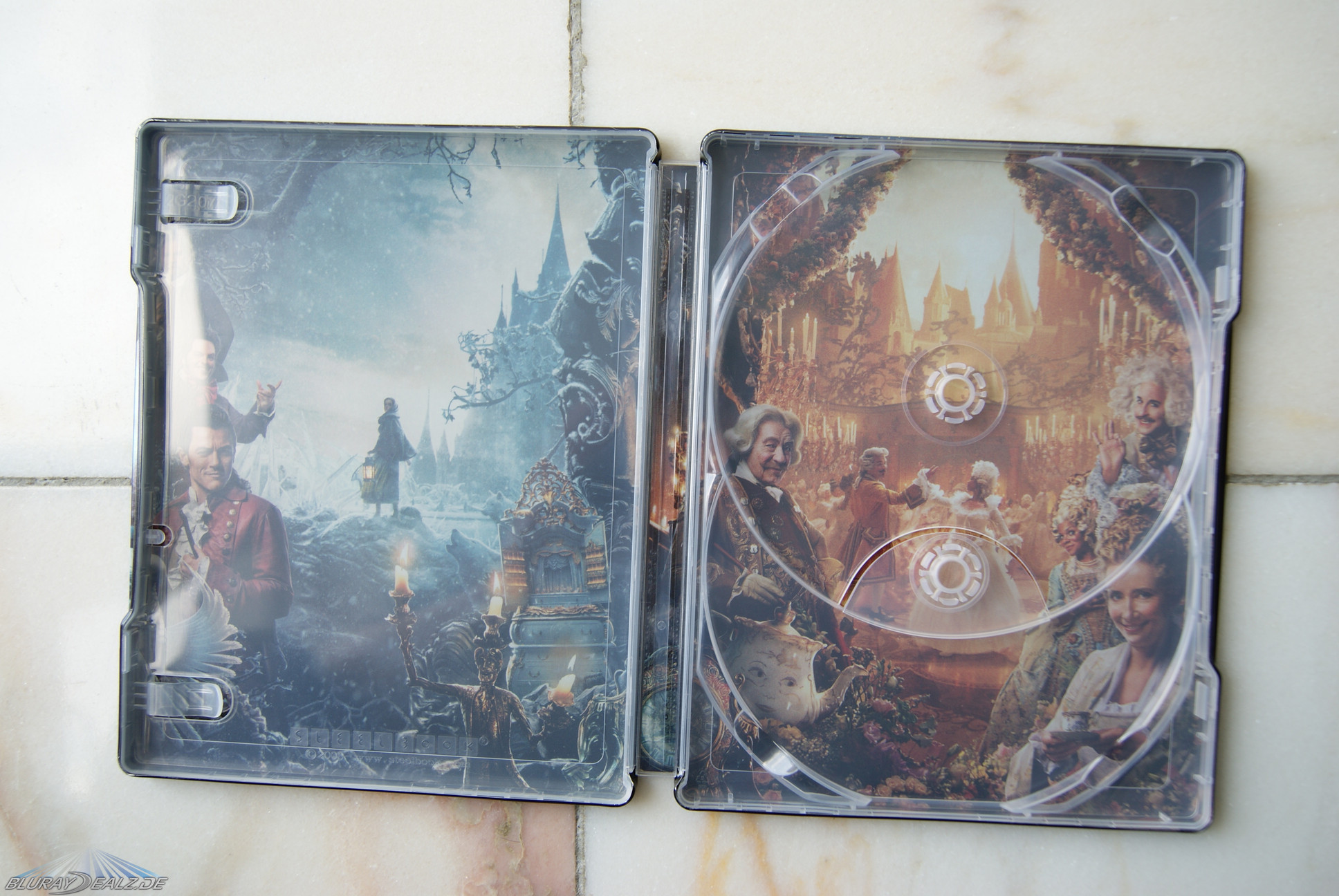 Wie gewohnt aus dem Hause Disney ein echter Höhepunkt. Ähnlich wie beim Steel zu „Alice im Wunderland 2“ ist es zweigeteilt und zeigt die diversen Charaktere in menschlicher und/oder verwandelter Gestalt. Das ergibt am Ende schon fast ein Suchspiel, bei dem man schaut, wen man alles wiederfindet. Die linke Seite ist in dunkelblau gehalten (mit ganz tollen Glanzeffekten bei Belles Laterne und Lumiéres Kerzen), die rechte Seite in gold. Kontrast, Schärfe, Farbintensität und Detailreichtum sind schwer zu überbieten.