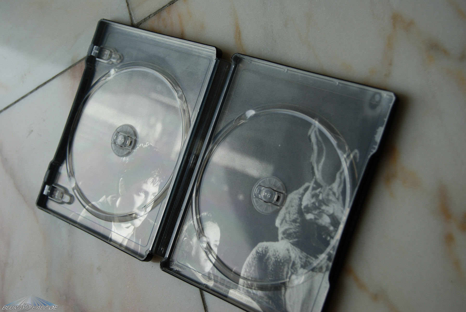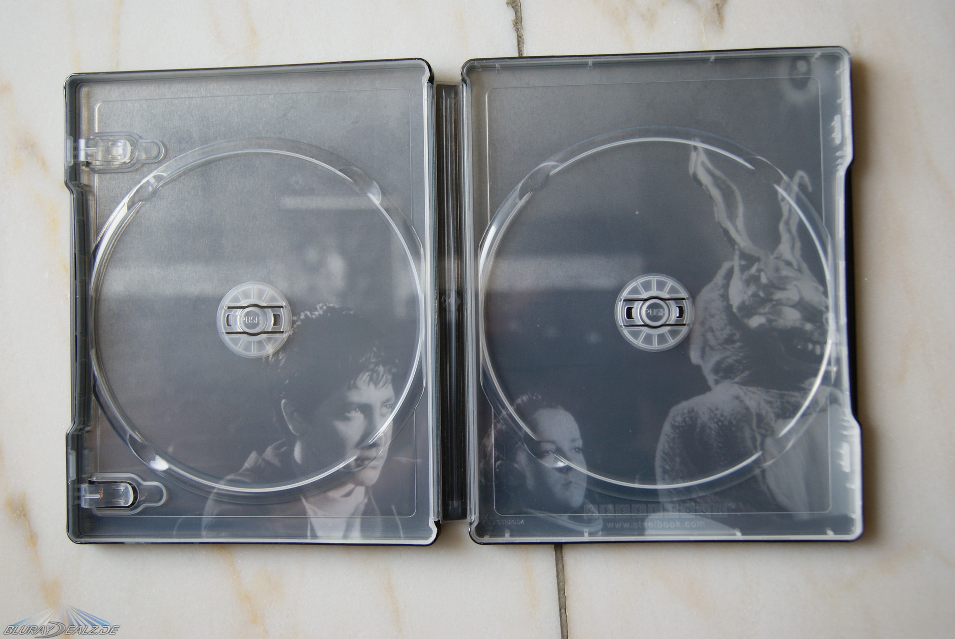 Im Inneren finden wir links die Disc mit der Kinofassung und rechts die mit dem Director´s Cut. Die Motive hierauf spiegeln genau die Motive auf Front und Back des Steelbooks (Hase und Briefkasten) – wieder etwas langweilig. Im ersten Moment des Öffnens hatte ich schon fast befürchtet, dass es gar kein Innendruck gibt – doch der Eindruck täuschte glücklicherweise. Nach Entfernen der Discs sehen wir ein wiederum etwas langweiliges Innen-Artwork mit den beiden Hauptdarstellern nebst Frank, dem Hasen. Zwar im Licht wiederum schön glänzend, aber komplett ohne Farbe. Wieder etwas langw…. Ihr wisst schon.