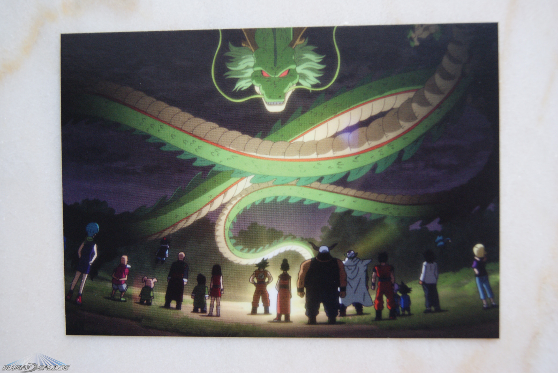 Auf der rechten Seite befinden sich beide Discs vertikal versetzt. Leider haben sowohl Blu-ray als auch DVD dasselbe Motiv. Dieses zeigt Son-Goku als Super-Saiyajin im Kampf in schönen kräftigen Farben. Auf der linken Seite befinden sich die drei Postkarten und das Booklet – dahinter ein scharf gedruckter schwarz-weiß Innenprint. Das Motiv ist allerdings wieder das Gleiche wie auf den Discs – da wäre echt mehr drin gewesen…