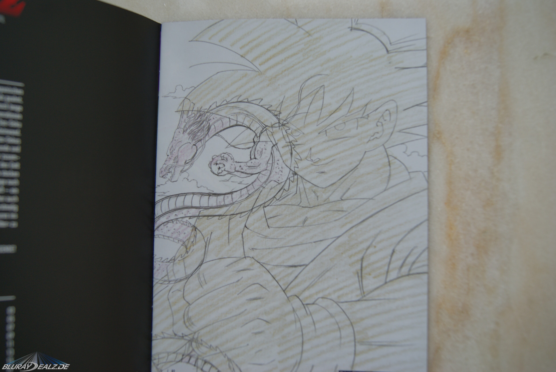 Die Postkarten sind auch als solche zu benutzen und haben schöne, farbige Motive (Son-Goku, Bösewicht Beerus, die Gruppe vor Polunga). Das Highlight der Edition ist neben dem Golddruck sicherlich das 24-seitige Booklet, das von Informationen und Bildern schier überquillt. Um den Überblick zu behalten befindet sich auf Seite 2 sogar ein Index. An Themen sind bspw. vorhanden: Akira Toriyama, Helden und Schurken, Schauplätze, ein Zeitstrahl zur Dragon Ball Geschichte u.v.m. Neben den tollen Farbbildern finden sich sogar zwei wirkliche schöne Bleistiftzeichnungen.