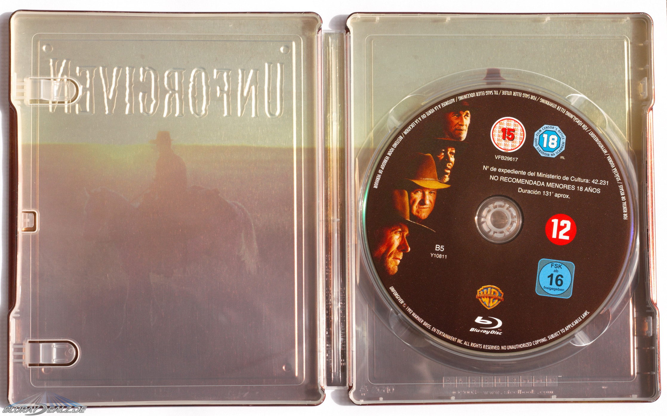 Der Spine zeigt mittig den englischen Titel „Unforgiven“ sowie ein Blu-ray und Warner Brothers Logo.