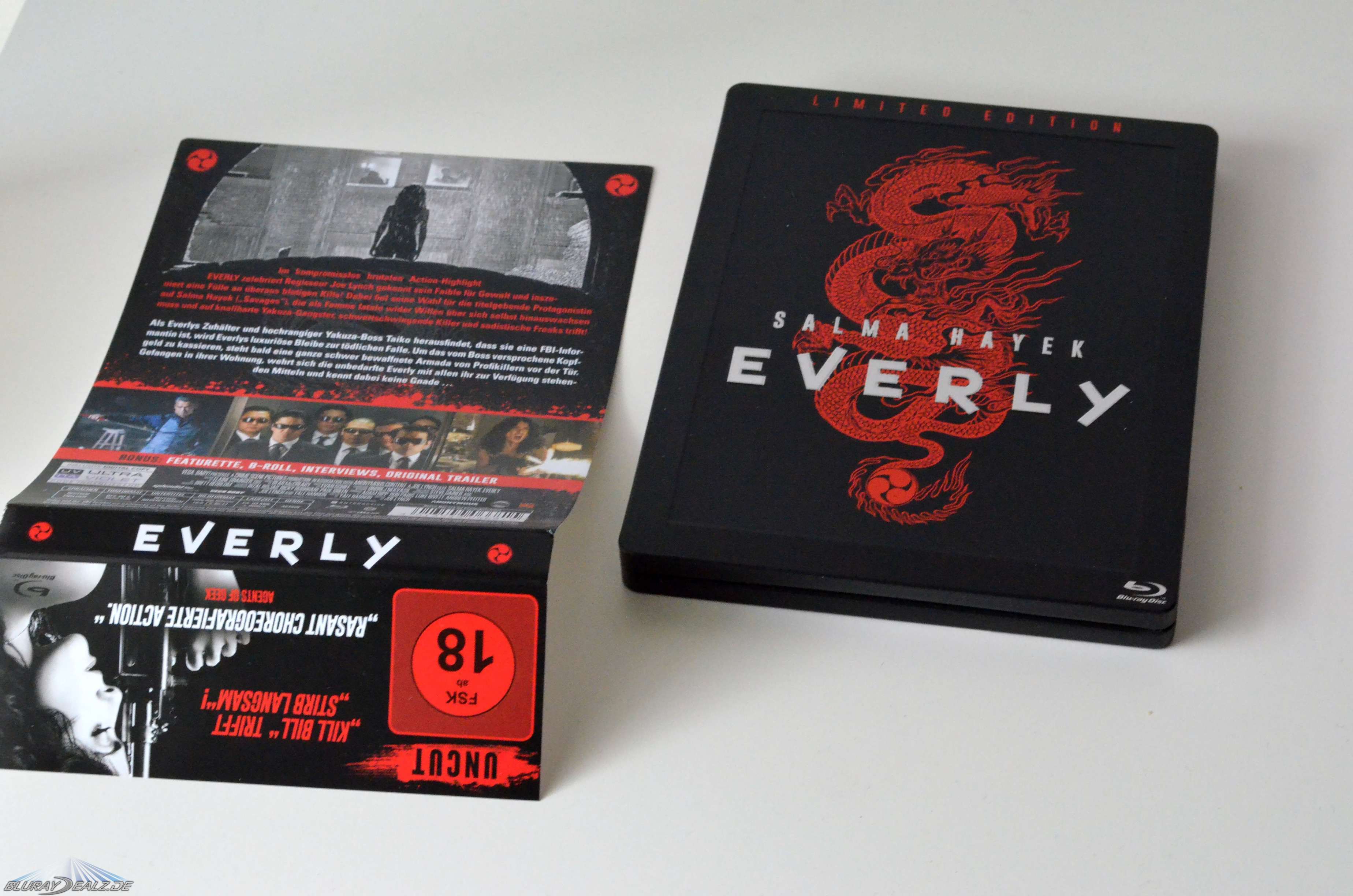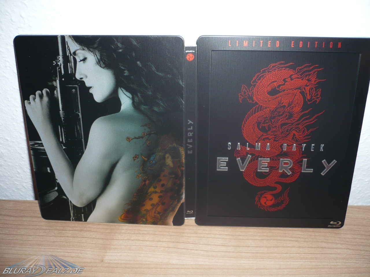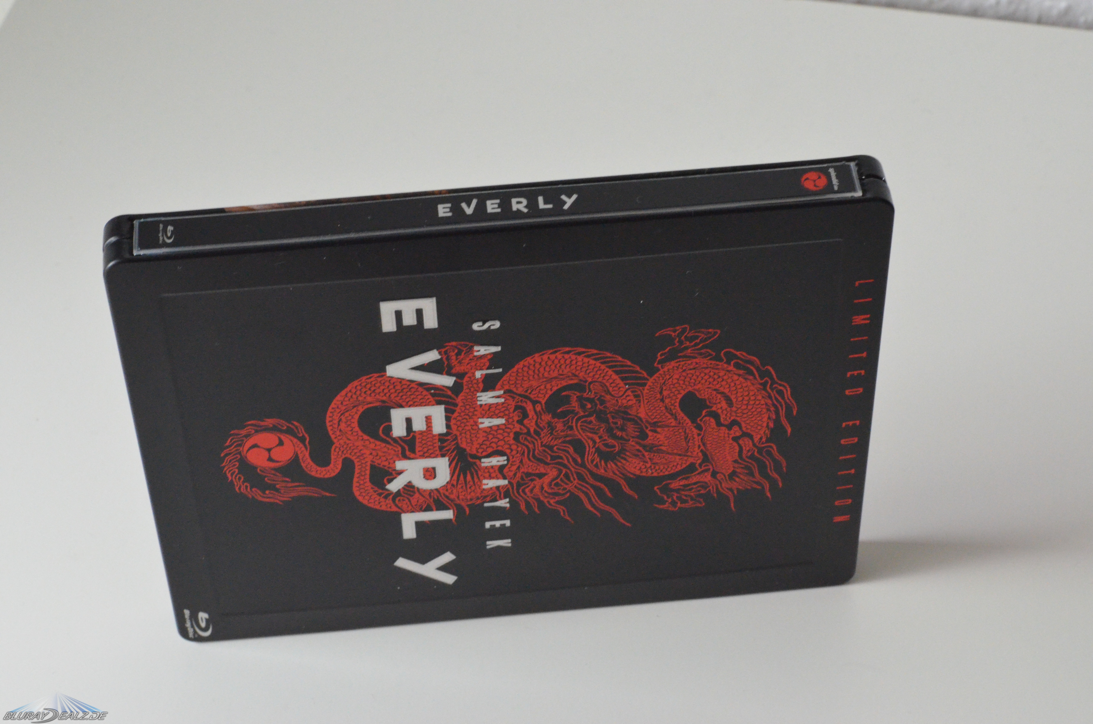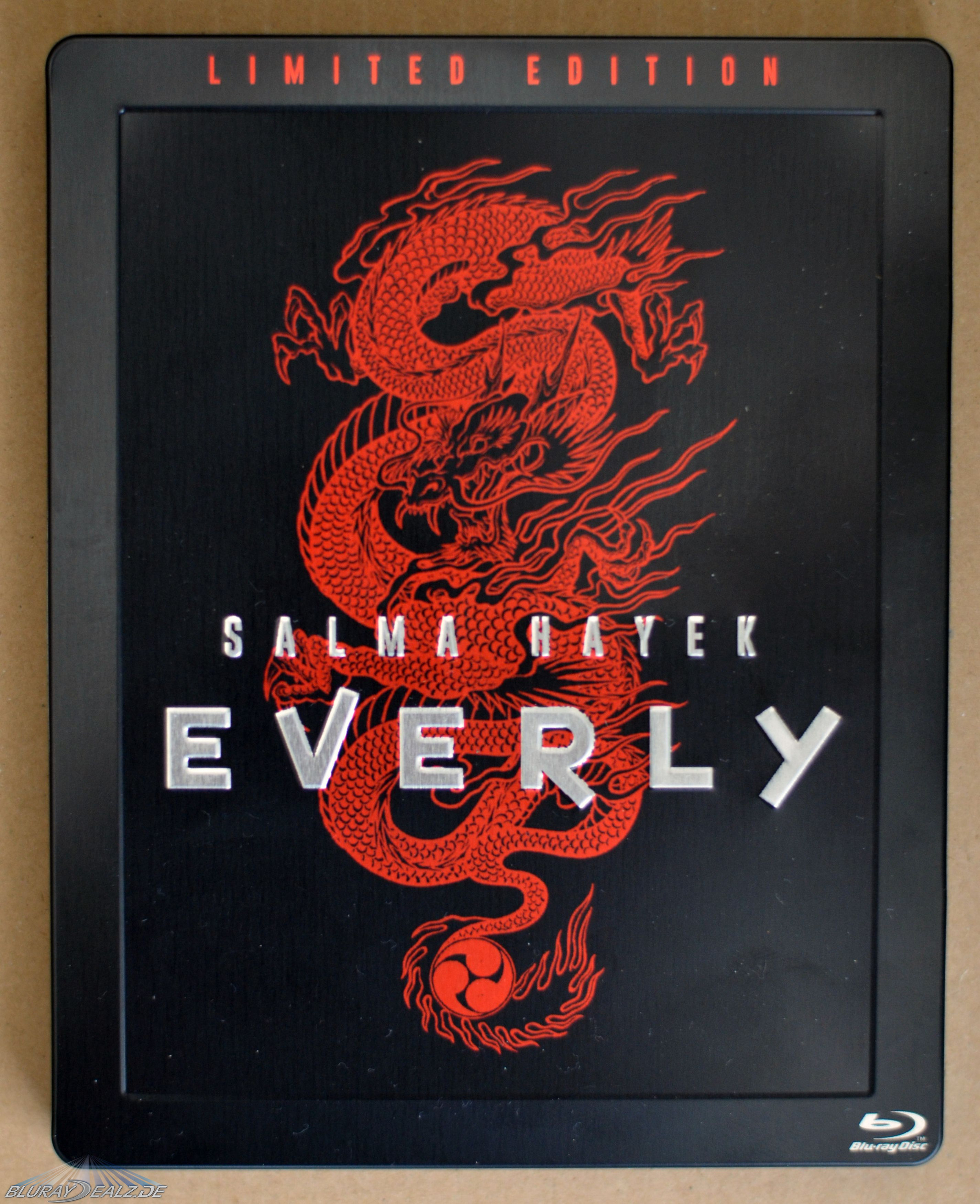Im mittleren Bereich des Covers ist im selben roten Farbton ein Drache dargestellt, das typische Symbol für die Yakuza. Auf dem Drachenbild ist in Silber der Titel „Everly“ sowie der Name der Hauptdarstellerin „Salma Hayek“ aufgeprägt. Das ganze Cover besitzt also nur 3 Farben (Schwarz, Rot, und Silber) und wirkt dadurch sehr aufgeräumt, übersichtlich und hebt damit den Schriftzug und den Drachen ab.