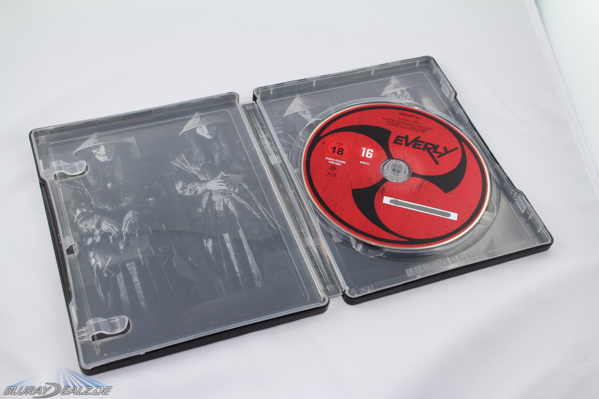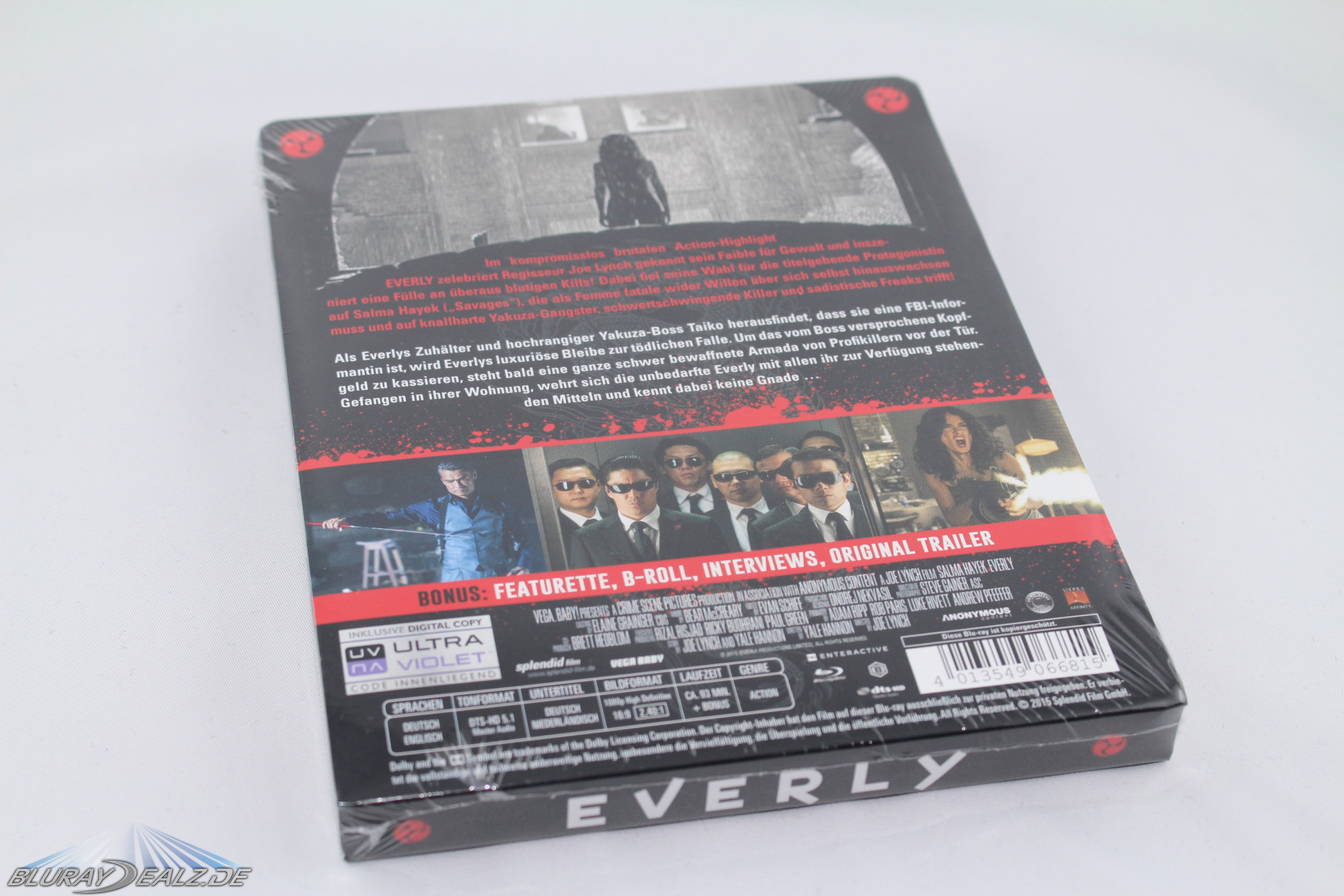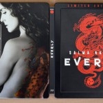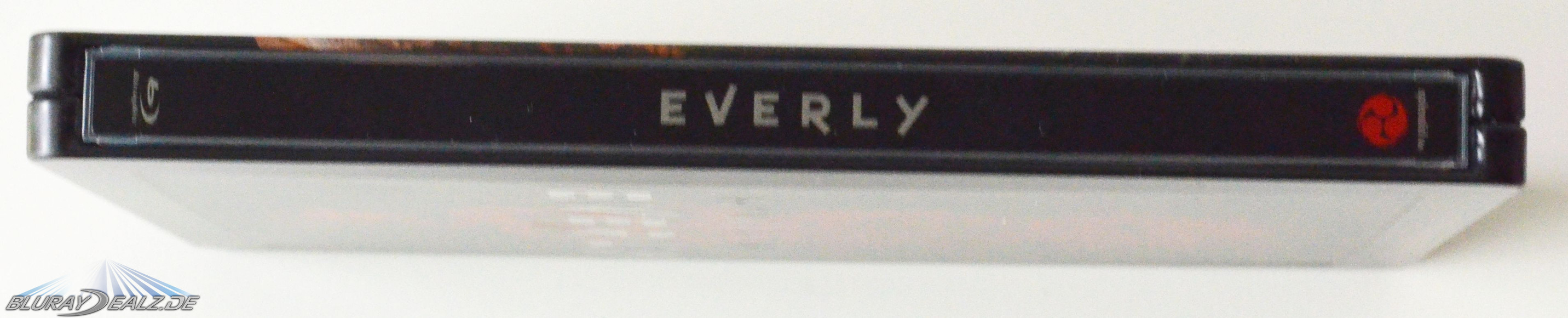 Im mittleren Bereich des Covers ist im selben roten Farbton ein Drache dargestellt, das typische Symbol für die Yakuza. Auf dem Drachenbild ist in Silber der Titel „Everly“ sowie der Name der Hauptdarstellerin „Salma Hayek“ aufgeprägt. Das ganze Cover besitzt also nur 3 Farben (Schwarz, Rot, und Silber) und wirkt dadurch sehr aufgeräumt, übersichtlich und hebt damit den Schriftzug und den Drachen ab.