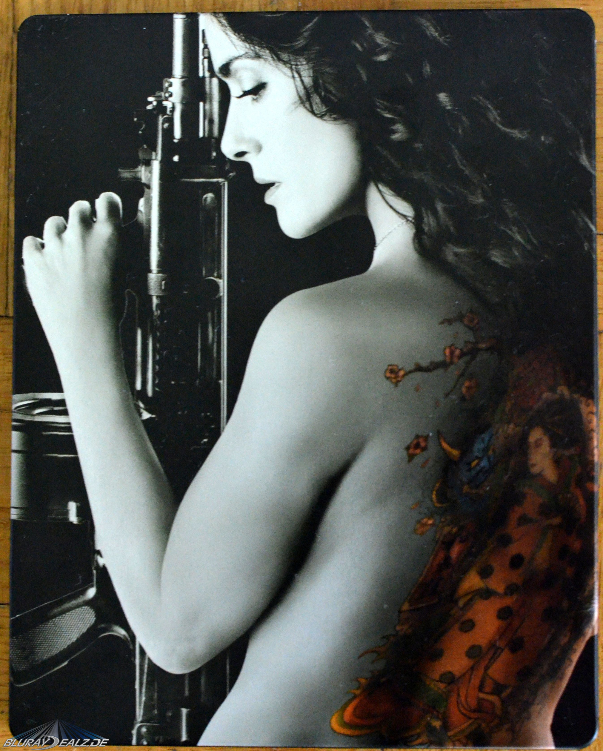 In Schwarz/Silbergrau gehalten, zeigt das Bild eine nachdenkliche Hauptdarstellerin von hinten. Ihr nackter Rücken ziert ein farbiges japanisches Tattoo. In den Händen hält sie ein Ultimax 100 Maschinengewehr und stützt ihr Stirn drauf ab. Das Bild entspricht dem Frontcover der Amaray Version. Durch den großen Schwarz/Silbergrau Bereich kommt das Tattoo mit den verschiedenen Motiven wunderbar zur Geltung. Es ist ein richtiger Blickfang.
