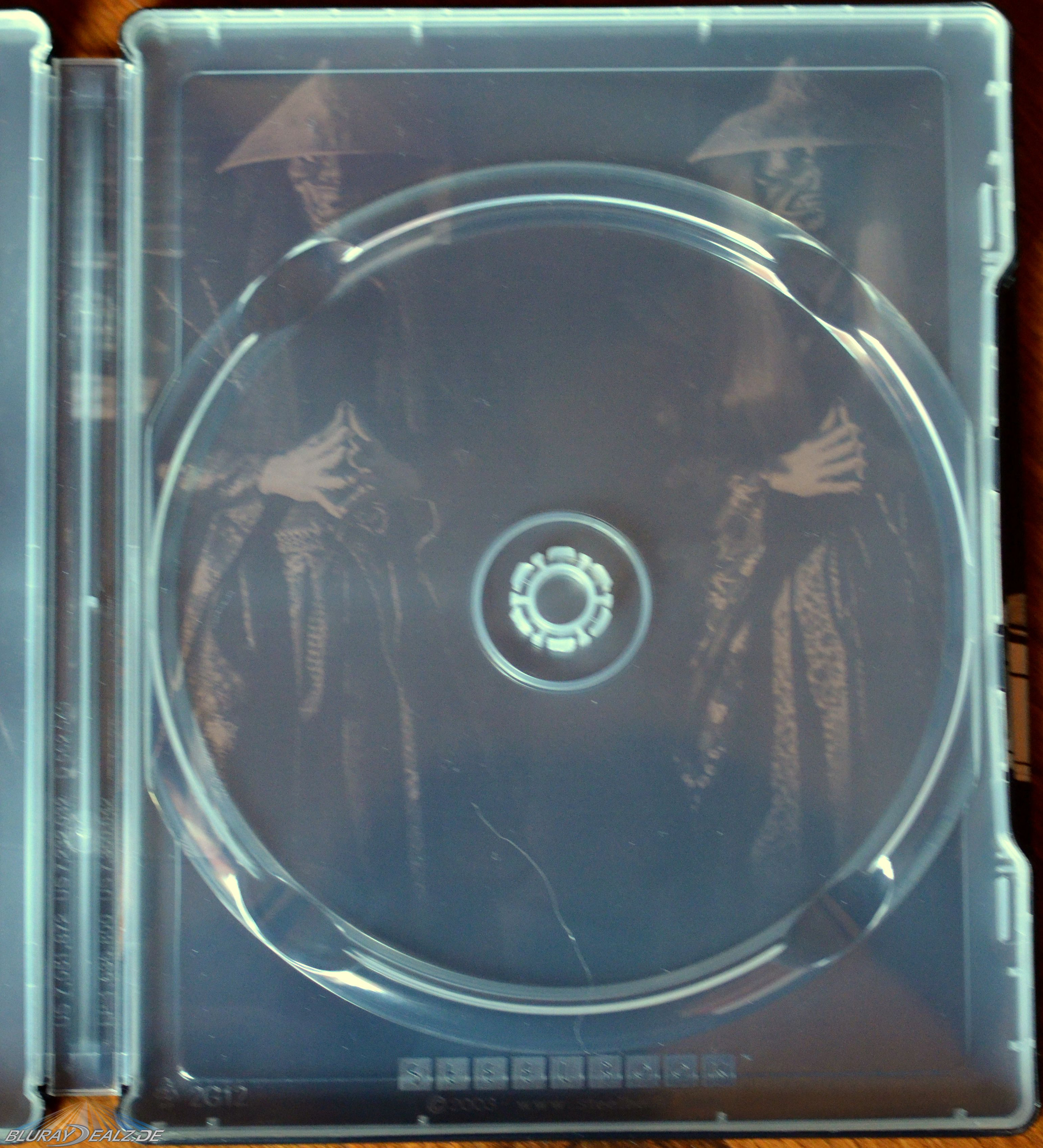 Das Frontcover ist mit einem geprägten Rahmen versehen, oberhalb ist in roter Schrift der Hinweis auf „Limited Edition“ aufgedruckt, was ich persönlich nicht glaube, da jeder Händler dieses Steelbook anbietet. Vielleicht limitiert auf 500.000 Stück ;). Rechts unten am Rahmen ziert in Silber das Symbol für Blu-ray Disc.