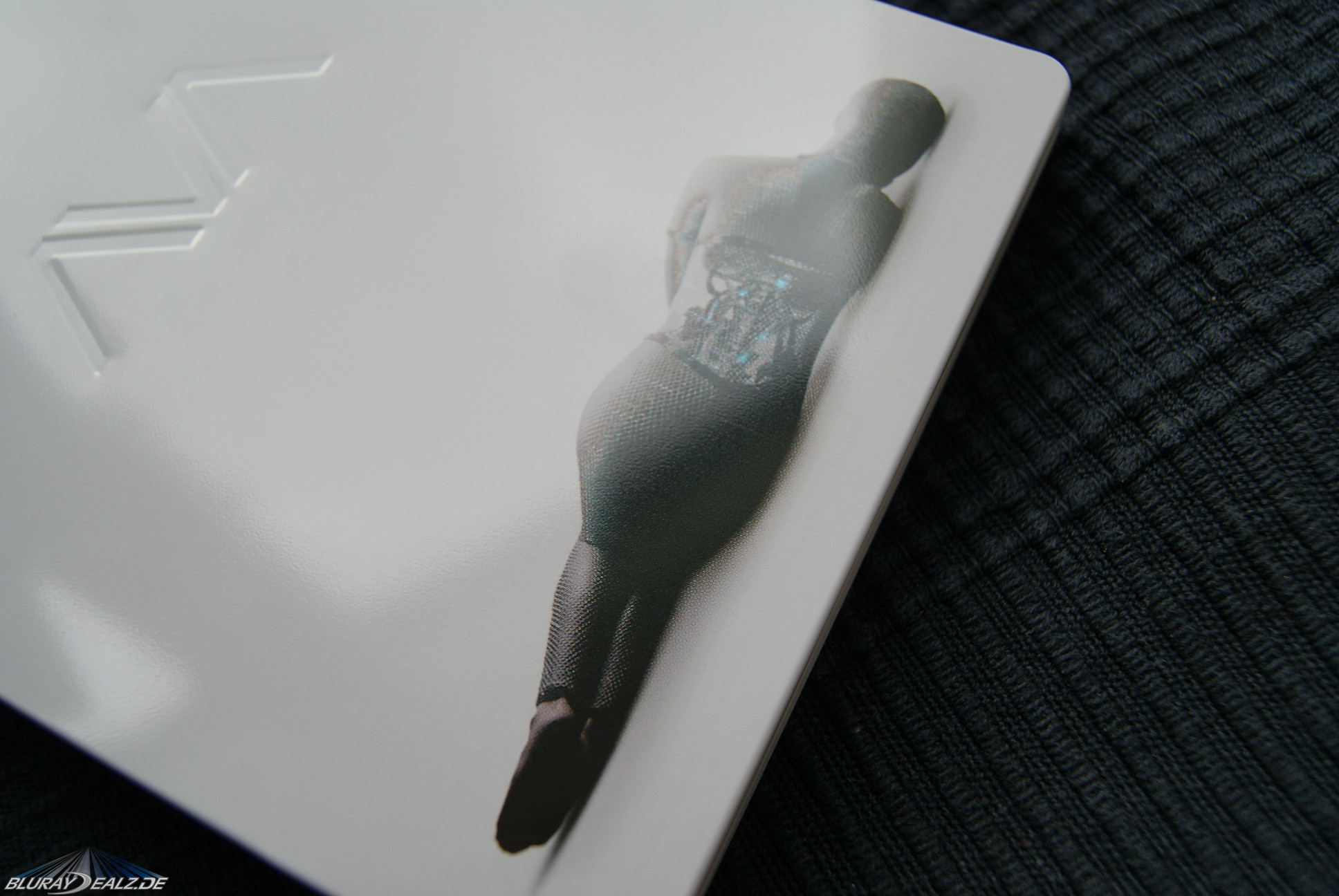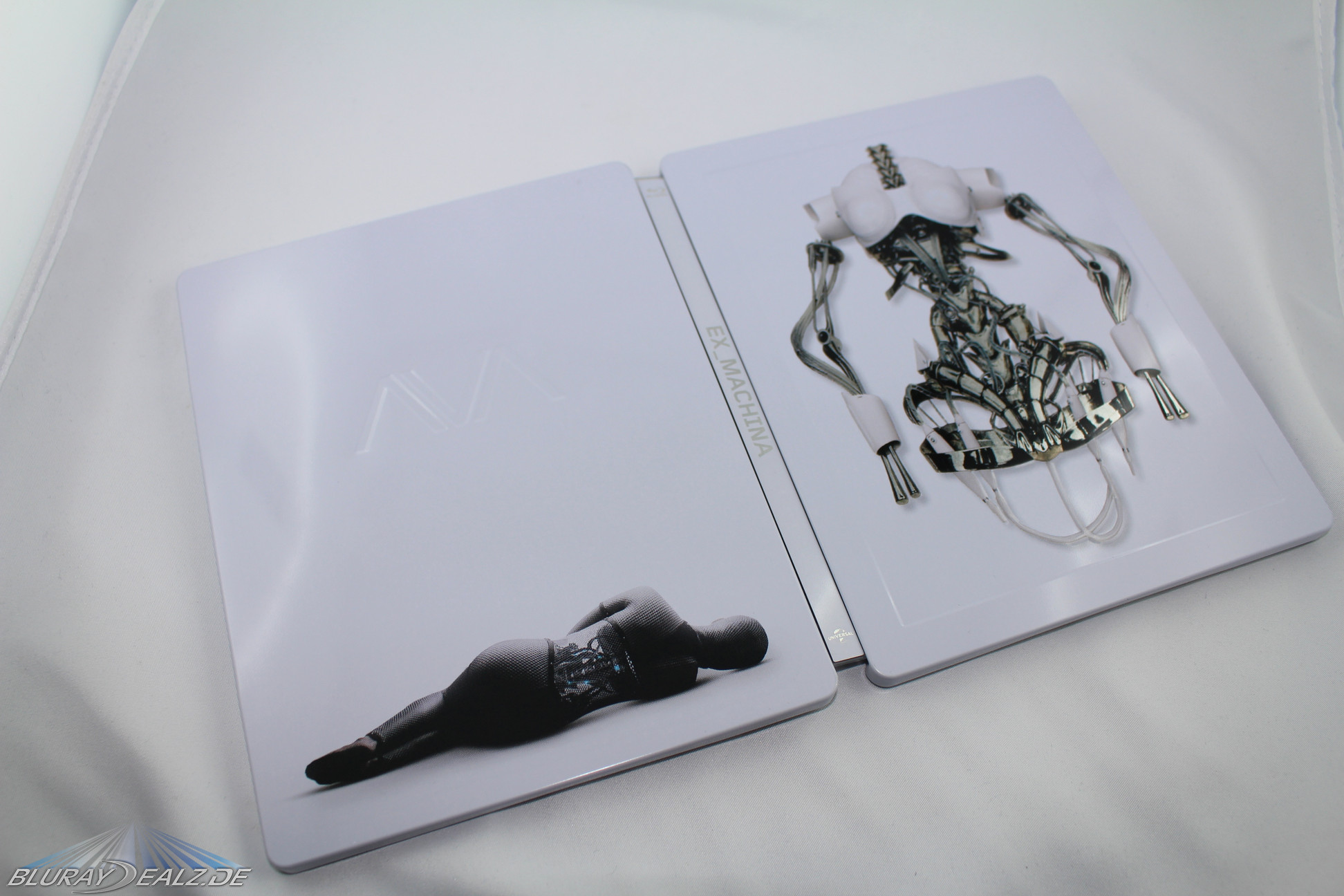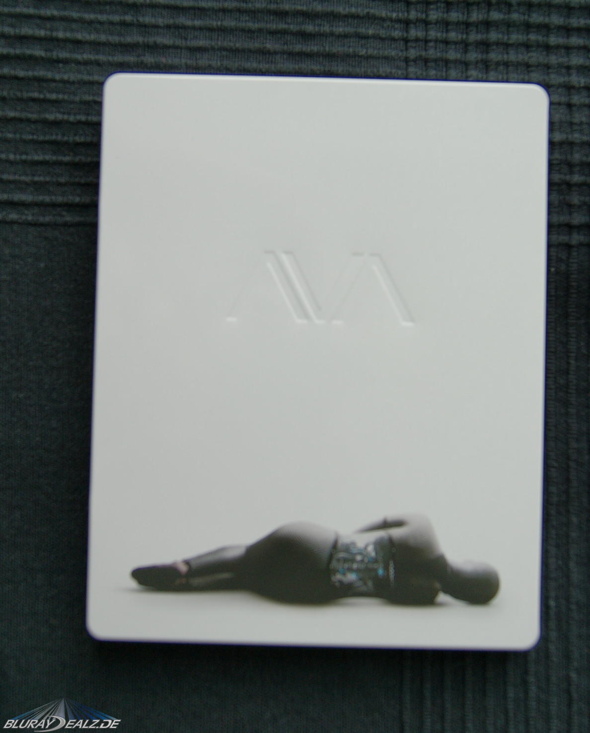 Tja und auf der Rückseite geht es mit dem Schwärmen weiter, denn auch diese Seite bietet fast alle Vorteile der Front. Der Hintergrund ist wiederum glossy weiß und Text ist wiederum keiner zu finden – weder Credits noch irgendwelche Logos. Im oberen Bereich steht „AVA“ und das wunderbarerweise nach innen geprägt. Im unteren Bereich befindet sich die auf der Seite liegende Ava, die uns ihre Kehrseite zeigt. Sie kommt in einem Glanzdruck daher und schimmert im Licht (selbst der Schatten, den sie wirft). Ihre metallischen Teile glitzern und in ihrem „Inneren“ sind hier und da einige blaue Lichter zu erkennen. Perfekt!Fehlt eigentlich nur eine weitere Rahmenprägung…