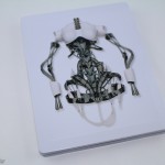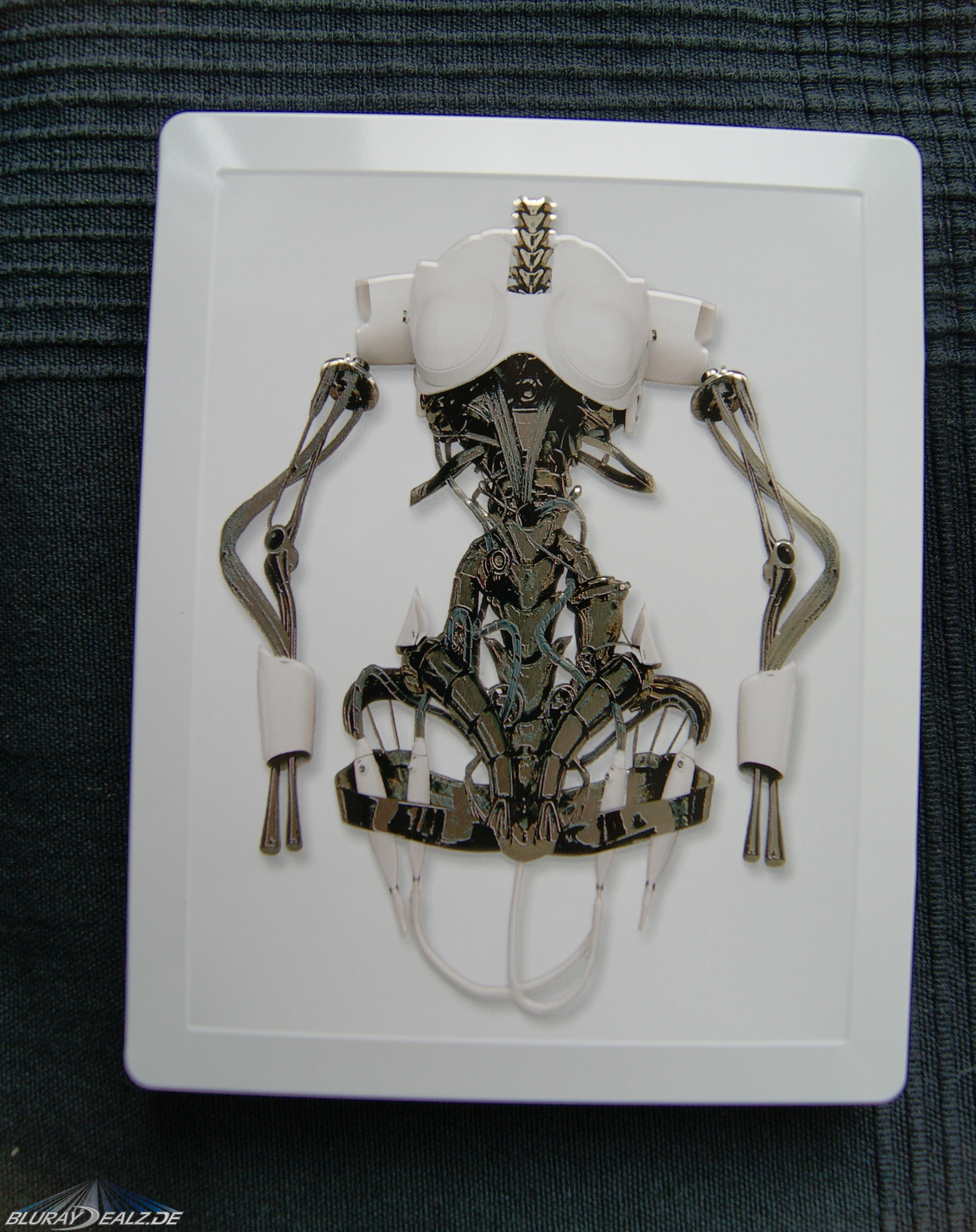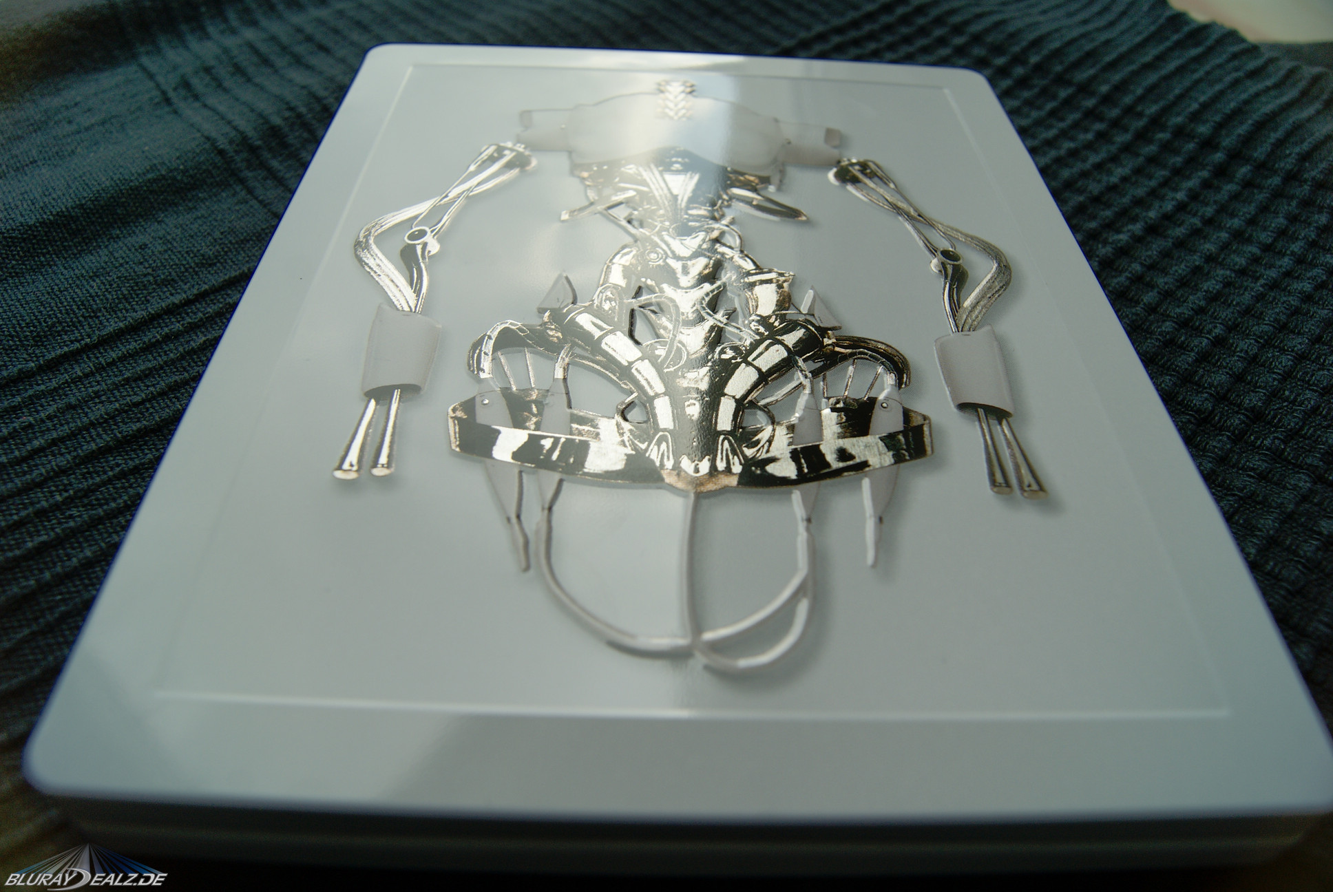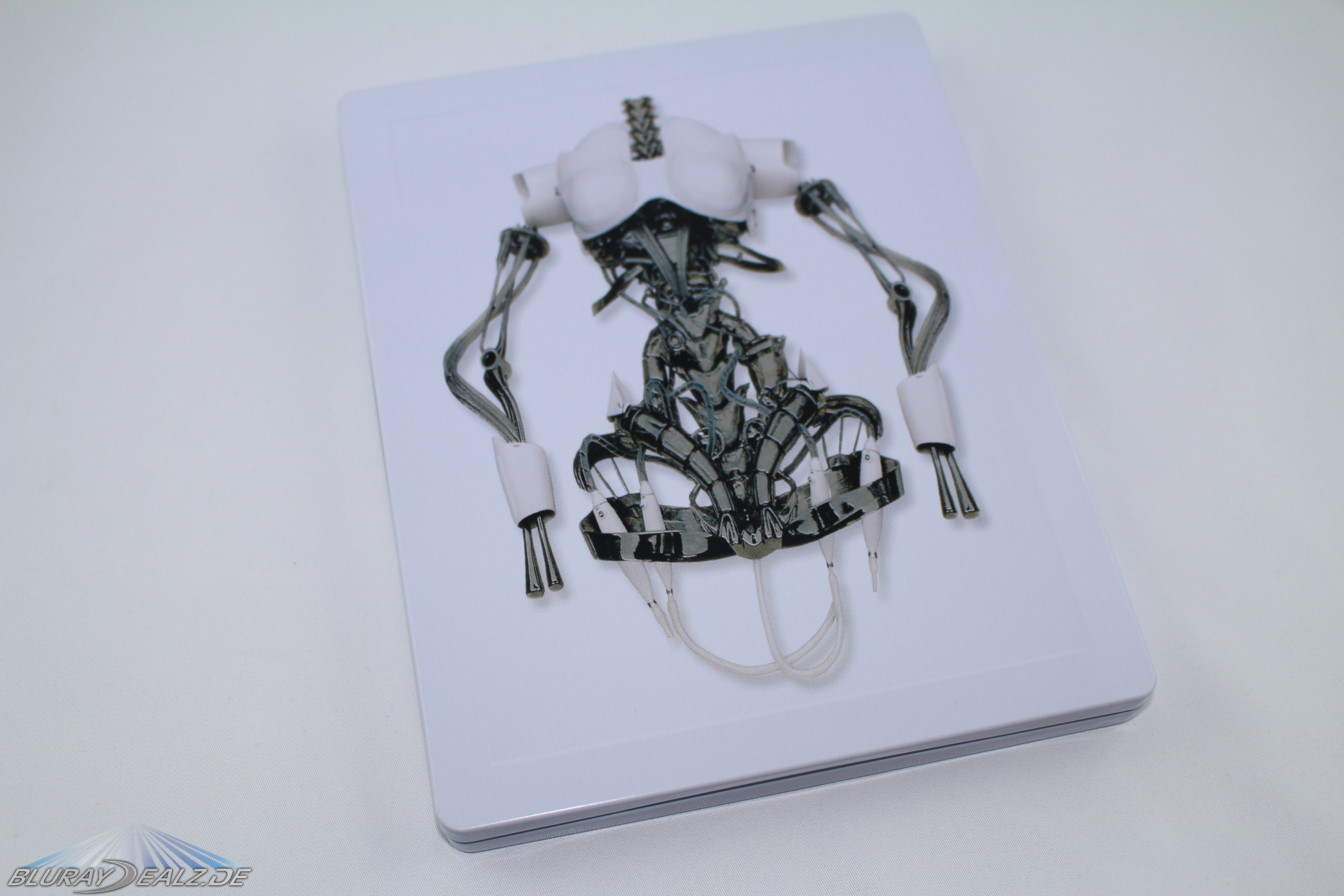 Tja und auf der Rückseite geht es mit dem Schwärmen weiter, denn auch diese Seite bietet fast alle Vorteile der Front. Der Hintergrund ist wiederum glossy weiß und Text ist wiederum keiner zu finden – weder Credits noch irgendwelche Logos. Im oberen Bereich steht „AVA“ und das wunderbarerweise nach innen geprägt. Im unteren Bereich befindet sich die auf der Seite liegende Ava, die uns ihre Kehrseite zeigt. Sie kommt in einem Glanzdruck daher und schimmert im Licht (selbst der Schatten, den sie wirft). Ihre metallischen Teile glitzern und in ihrem „Inneren“ sind hier und da einige blaue Lichter zu erkennen. Perfekt!Fehlt eigentlich nur eine weitere Rahmenprägung…
