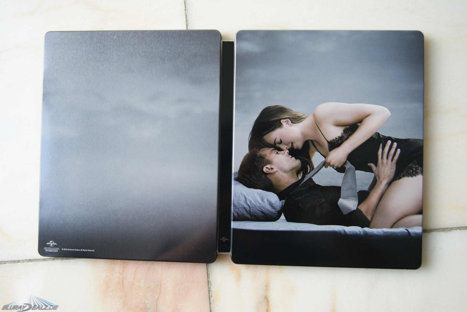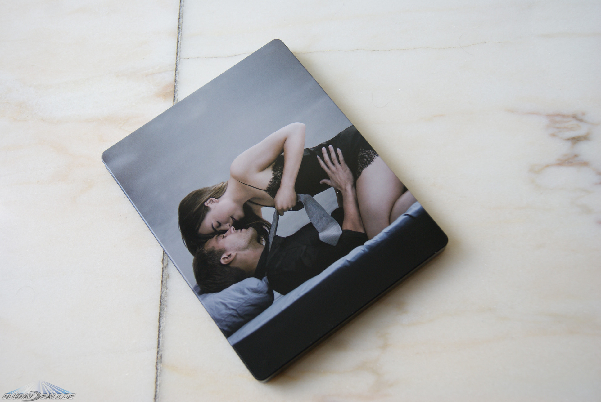 ) einigen Schattierungen. Das Motiv – Ana (Dakota Johnson) in fordernder Pose und wunderbar knapp bekleidet auf Christian (Jamie Dornan) – ist farbig, wenn auch recht farbarm, da sowohl Bett als auch Kleidung in Schwarz bzw. Grautönen gehalten sind. Lediglich die aufblitzende Haut hat mehr Farbe. Das Motiv geht auf der Außenseite weiter.