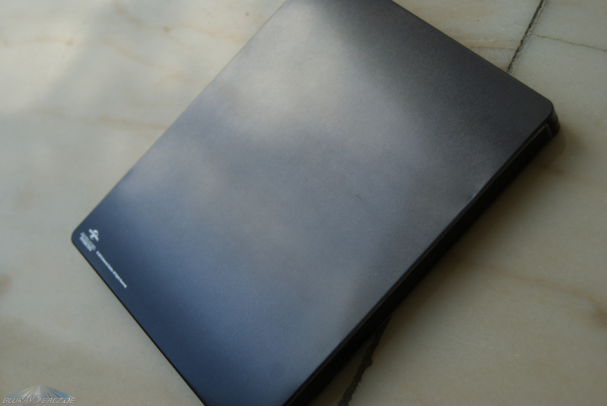 Das Steelbook kommt wie seine Vorgänger in absolut passendem Hochglanz daher. Der Hintergrund hier weist ein eher dunkles Grau auf mit (wie passend