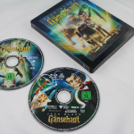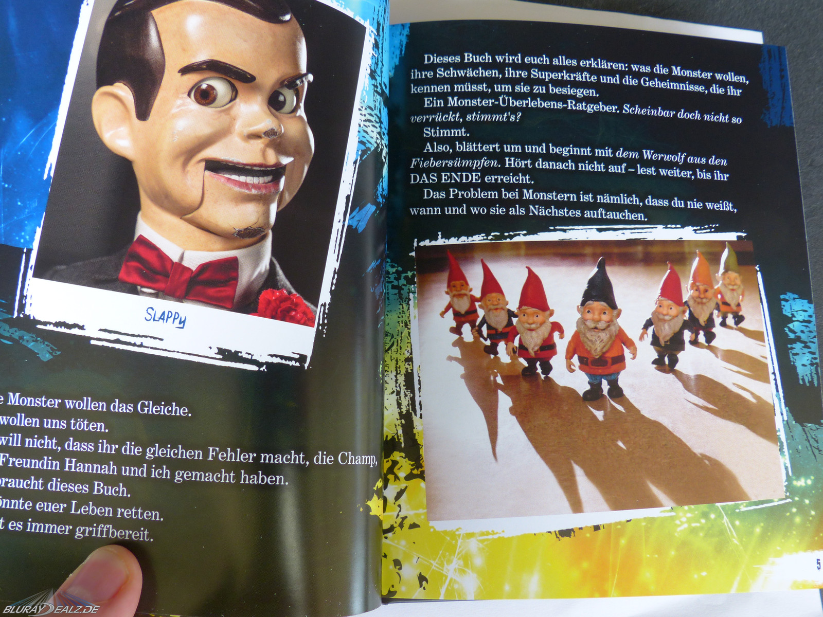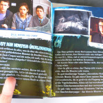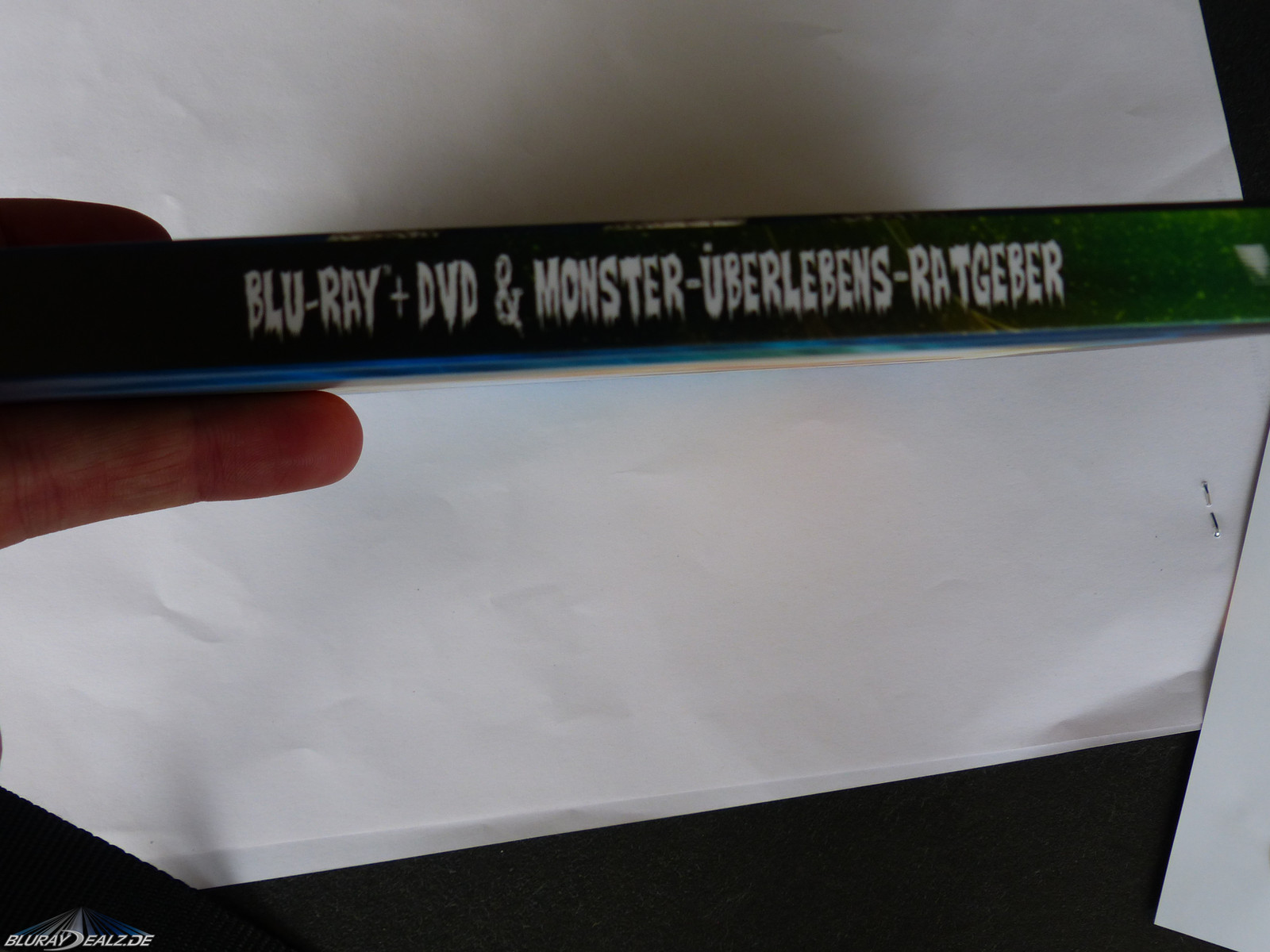 Gleich drei Dinge fallen beim erstmaligen ansehen des Digibook auf: 1. Der Titel ist geprägt. 2. Das Digibook hat eine G2 Größe (ist also genau so groß wie eine normale Blu-ray Hülle und 3. Der Buchrücken/ Spine hat keinen Titel. Letzteres kann ich mir nicht erklären. Mein Sammlerherz würde jetzt sagen: „Das ist ein Fehldruck und damit steigt der Sammelwert.“ Nun keine Ahnung warum da jetzt nur der Inhalt steht…aber das ist so ziemlich der einzige Minuspunkt einer sehr ordentlichen Edition. Diese besteht aus einer Blu-ray mit der 2D Version des Filmes, dem Film auf DVD und dem Digitalcode. Abgerundet wird es in einer sehr hochwertigen und (vom Titel her) geprägten Buchverpackung und einem fetten 32 Seitigem eingefassten Booklet, welches über alle Monster und deren Herkunft und Stärken und Schwächen informiert. Es ist wirklich sehr schön gemacht und echt toll geschrieben. Die J-Cards ist mit Klebepunkten festgemacht und lässt sich leicht und rückstandslos lösen.