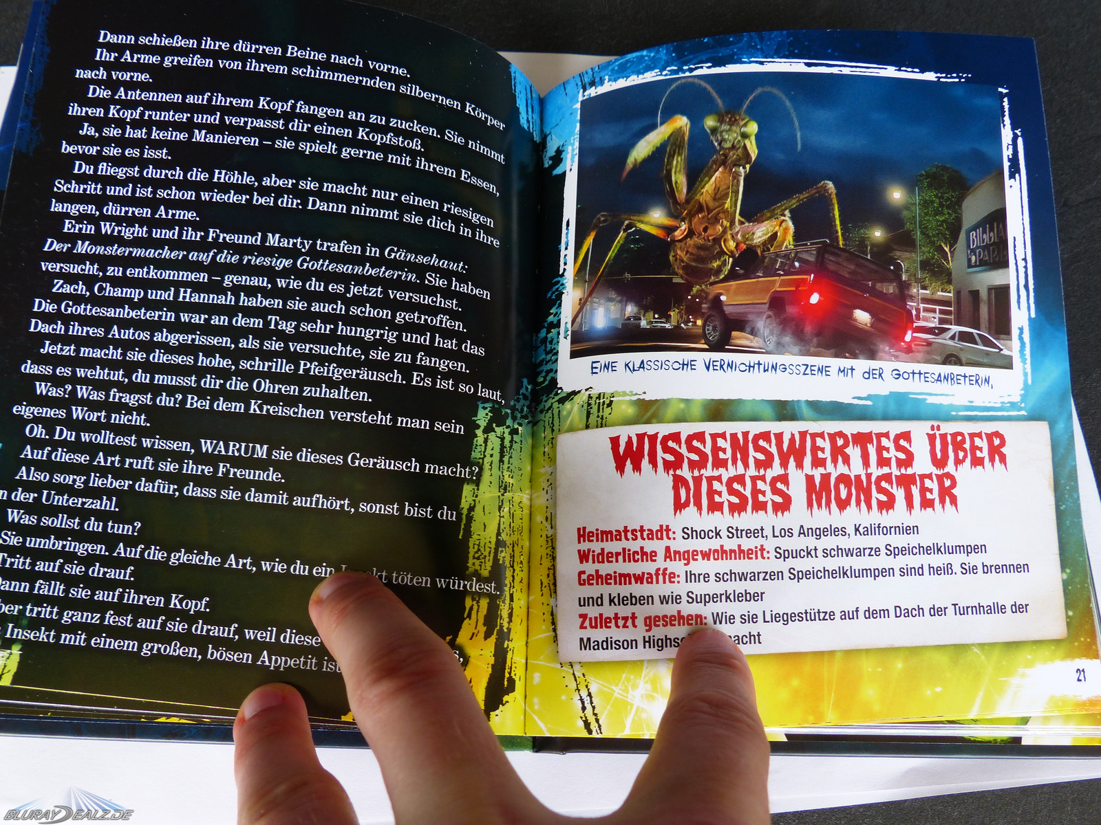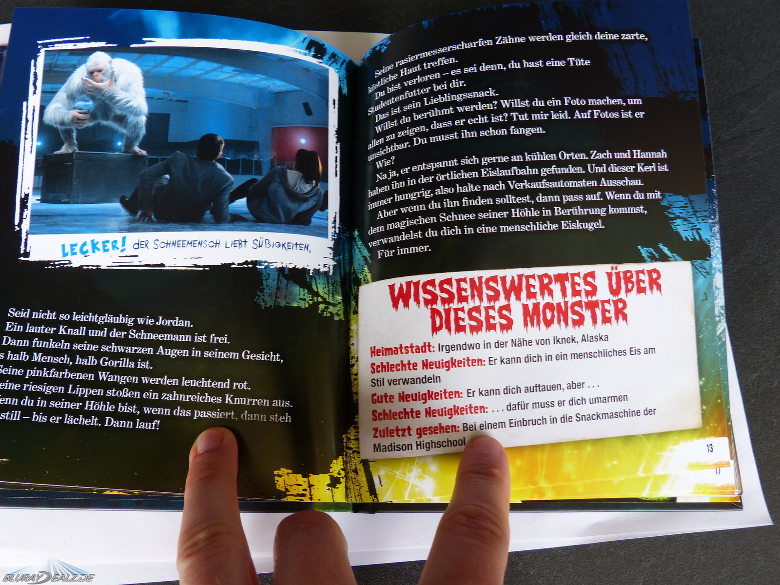 Das Backcover hat die gleichen Stärken wie die Front. Glänzende Oberfläche, satte Farben und ein wunderbares Motiv (die Hauptdarsteller versuchen ein menschengroßes Buch zuzudrücken, aus dem bereits die Extremitäten diverser Monster herausdrängen). Die Rückseite kommt sogar gänzlich ohne jeden Text aus.