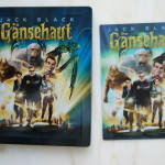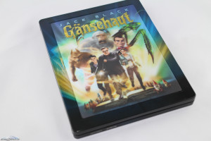 Die J-Card lappt oben über. Sie ist zwar etwas schmaler als das Steel, passt aber trotzdem nicht ohne weiteres in das Steel. Positiv zu vermerken ist, dass sie lediglich auf der Vorderseite mit einem Klebesticker befestigt ist, negativ, dass dieser Reste hinterließ – die aber mit etwas Aufwand wieder entfernbar waren. Der FSK-Flatschen klebte direkt auf dem Steel, war aber rückstandsfrei und problemlos zu entfernen. Durch die J-Card befindet sich – außer dem Titel und dem Namen „Jack Black“ – keinerlei Text auf dem Steelbook.