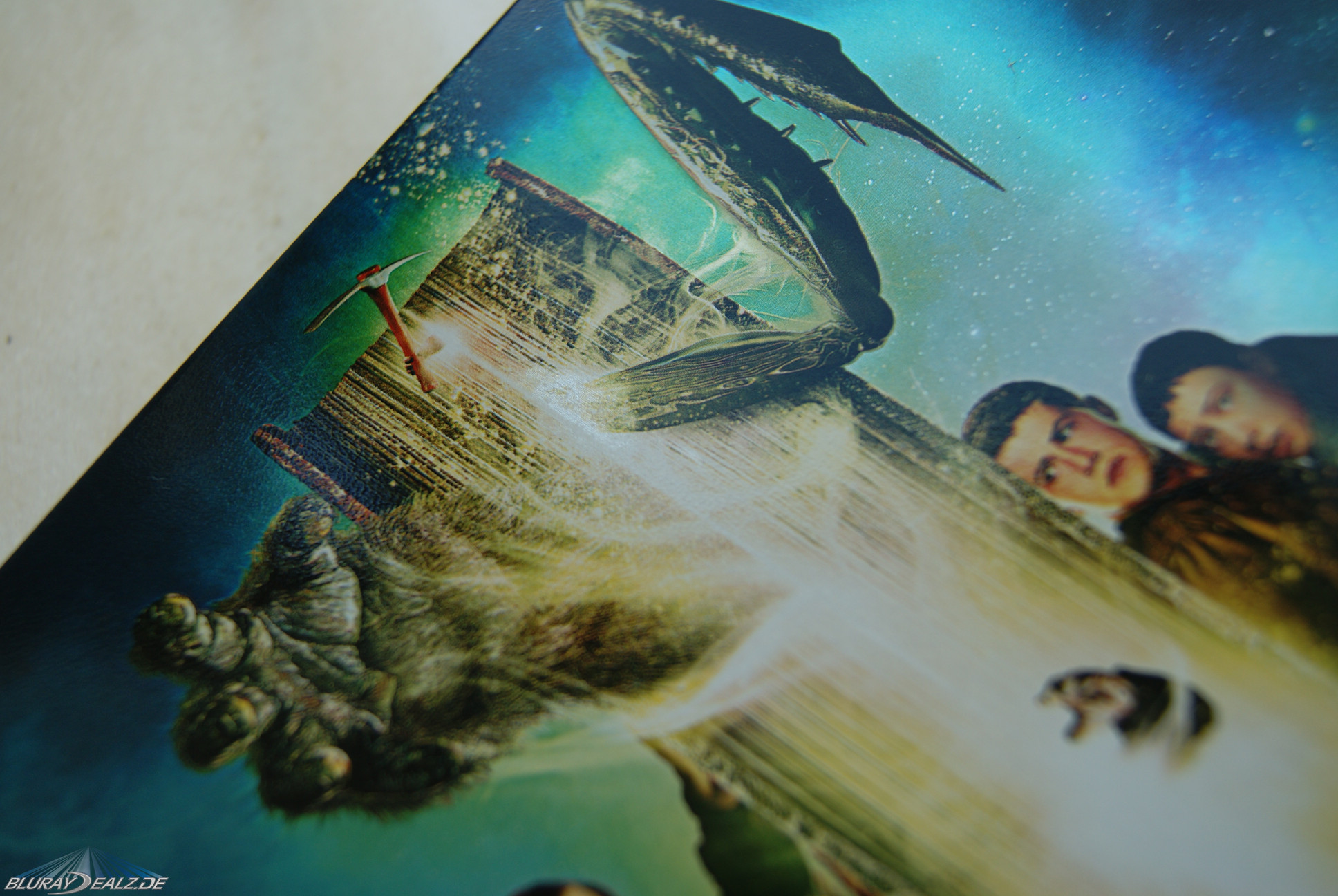 Die Lenticular-Karte zeigt das Motiv des Steelbooks und passt sich der Frontseite genau an, passt also auch vom Bild genau in die Rahmenprägung hinein. Es hat eine ausgezeichnete Tiefenwirkung (die Personen und der Titel sind im Vordergrund, die Monster sind versetzt dahinter) und ein wenig Bewegung ist auch mit dabei. Auffällig war für mich lediglich, dass der Magnet ein wenig dünner ist, als bei den anderen Karten, die ich kenne. Es ist dadurch nicht ganz so stabil und etwas flexibler, was aber natürlich auf dem Steel nicht ins Gewicht fällt.