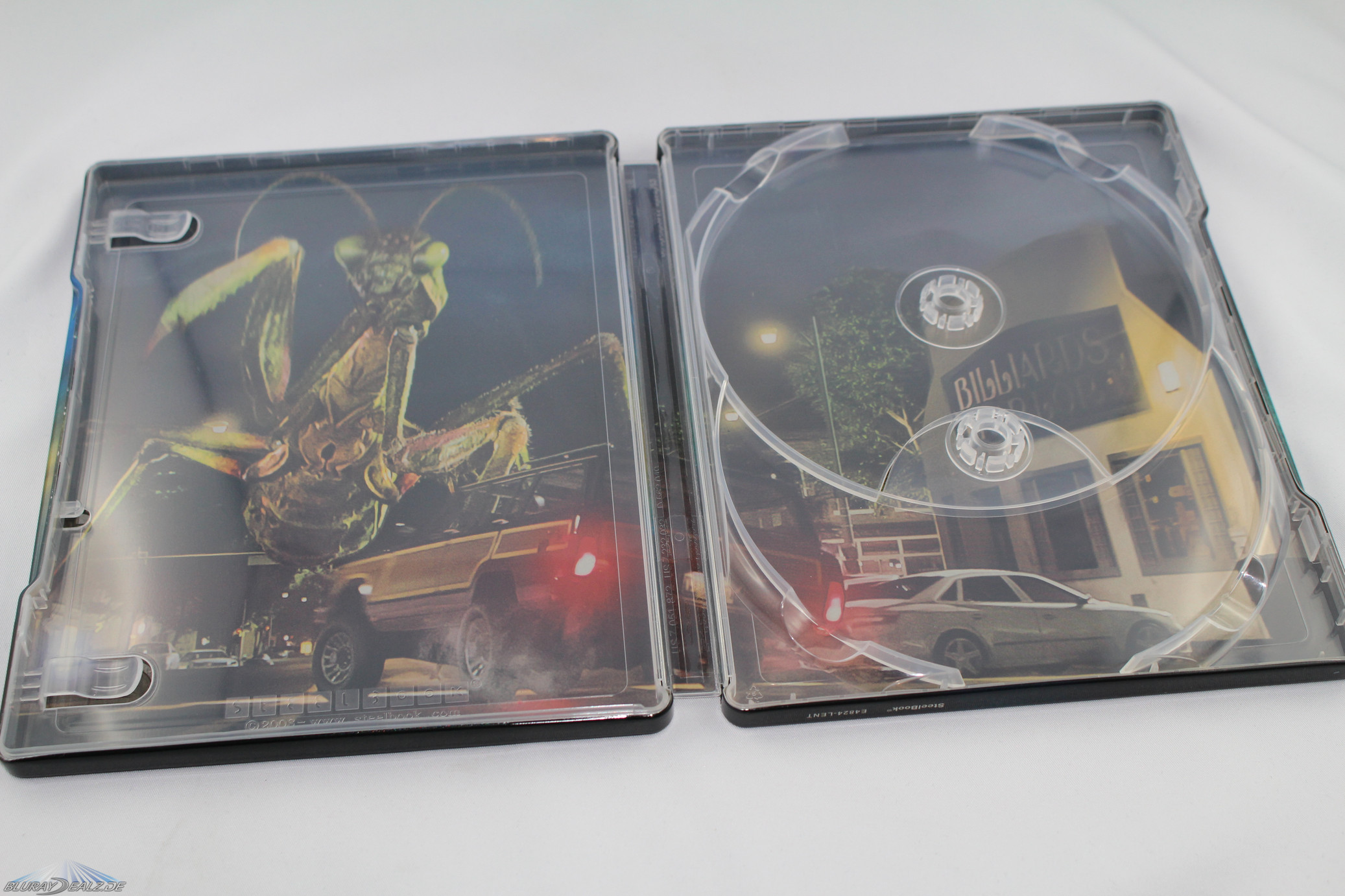 Die beiden Discs befinden sich vertikal versetzt auf der rechten Seite. Auf den farbig bedruckten Discs befinden sich zwei unterschiedliche Motive, wobei das auf der 3D-Disc dem Backcover entspricht. Der Innenprint zeigt eine Riesen-Heuschrecke, die die Kleinstadt überfällt. Der Druck ist wiederum kontrast- und farbenreich und erreicht bei mir die volle Punktzahl. Die Heuschrecke, die das zentrale Motiv des Bildes ist, befindet sich auf der linken Seite des Prints und ist damit auch bei eingelegten Discs immer zu sehen. Ein schönes Detail wie ich finde.