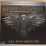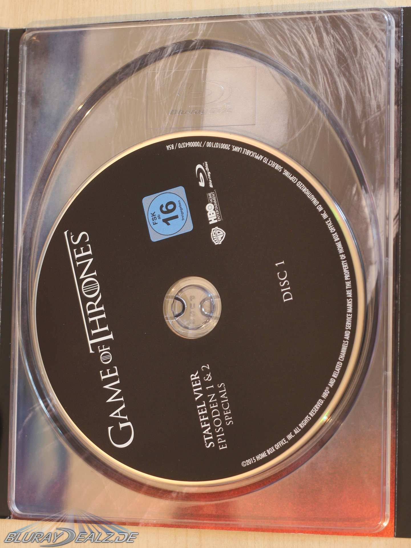 Entfernt man nun auch den Innenschuber, so hält man dann endlich das begehrte Digipack in Händen, welches aus relativ dünnem, allerdings stabilem Karton hergestellt ist. Im Digipack enthalten ist neben den vier Disc-Halterungen noch ein kleines vierseitiges Booklet, welches kurze Episodenbeschreibungen sowie eine Auflistung der Specials beinhaltet. Ein Poster wie bei den vorherigen Staffeln erwartet man hier leider vergebens. Ebenfalls hier vorzufinden ist der UV-Flyer, ein Werbeflyer für GoT-Merchandise und eine in einer separaten Hülle (mit Rabencover) untergebrachte Bonusdisc. Auf der Bonusdisc befinden sich drei „Behind the Scenes“-Dokumentationen zur vierten Staffel (siehe „Technische Aspekte“), die alle in englischem Originalton mit Untertiteln vorliegen.