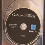 Die reguläre Fassung präsentiert sich ebenfalls mit Innen- und Außenschuber, während ersterer (bis auf die Breite) vollkommen identisch zu dem des Digipacks ist (inkl. Glanzeffekt der Schrift auf der Front). Er umschließt ebenfalls nach rechts geöffnet die Amaray, welche diesmal leider kein Booklet (und genauso wenig ein Poster) beinhaltet. Stattdessen sind die Episodenbeschreibungen auf der Innenseite des Inlays aufgedruckt. Ergo: kein Wendecover. Dafür sind mehr Werbeflyer enthalten, nämlich einserseits der bekannte Flyer für GoT-Merchandise und andererseits zwei weitere zu den Büchern+Apps und Sky. Die Discs sind ebenfalls identisch bedruckt.