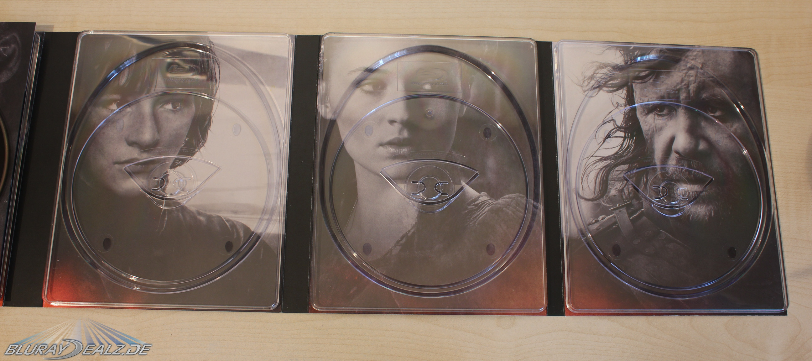 Während das Digipack design-technisch eine wahre Augenweide ist – nicht zuletzt aufgrund des extrem detaillierten Drucks der Charaktere – sind es die Disc-Halterungen nicht in diesem Ausmaß. Erneut sind sie wie Dracheneier geformt, was immer noch eine sehr gute Idee ist, und die Discs sitzen fest und sicher in ihnen, allerdings stört wie schon bei den Vorgängern das penetrante Blu-ray Disc-Logo, welches zu Lasten der Charakterabbildungen hinter den Halterungen geht und bei jeder einzelnen Halterung erneut aufgeführt wird. Schade.