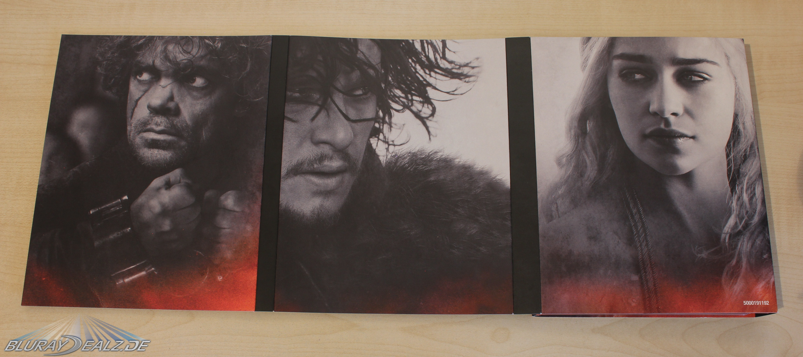 Doch zum Digipack selber: die Frontseite zeigt Cersei Lennister, die Rückseite (erneut mit Produktionsnummer versehen) Daenerys Targaryen. Klappt man das Digipack das erste Mal auf, so werden nun links Jamie Lennister und rechts Jon Snow abgebildet. Klappt man das Digipack nun weiter nach rechts auf, so ziert die finale Abbildung niemand Geringeres als Tyrion Lennister in Ketten. Während der Hintergrund von Daenerys und Jon Snow hell gehalten ist, sticht einem das tiefe Schwarz der Lennister-Hintergründe geradezu ins Auge. Zudem befindet sich am unteren Rand jeder Seite ein feuerroter Lichtschein, der die Charaktere symbolträchtig in eine düstere Aura zu stürzen versucht. Hierbei ist der Feuerschein bei Jon Snow passenderweise am geringsten ausgeprägt. Die Motive wirken hierbei wirklich imposant und sind – jedes für sich – hervorragend in Szene gesetzt.
