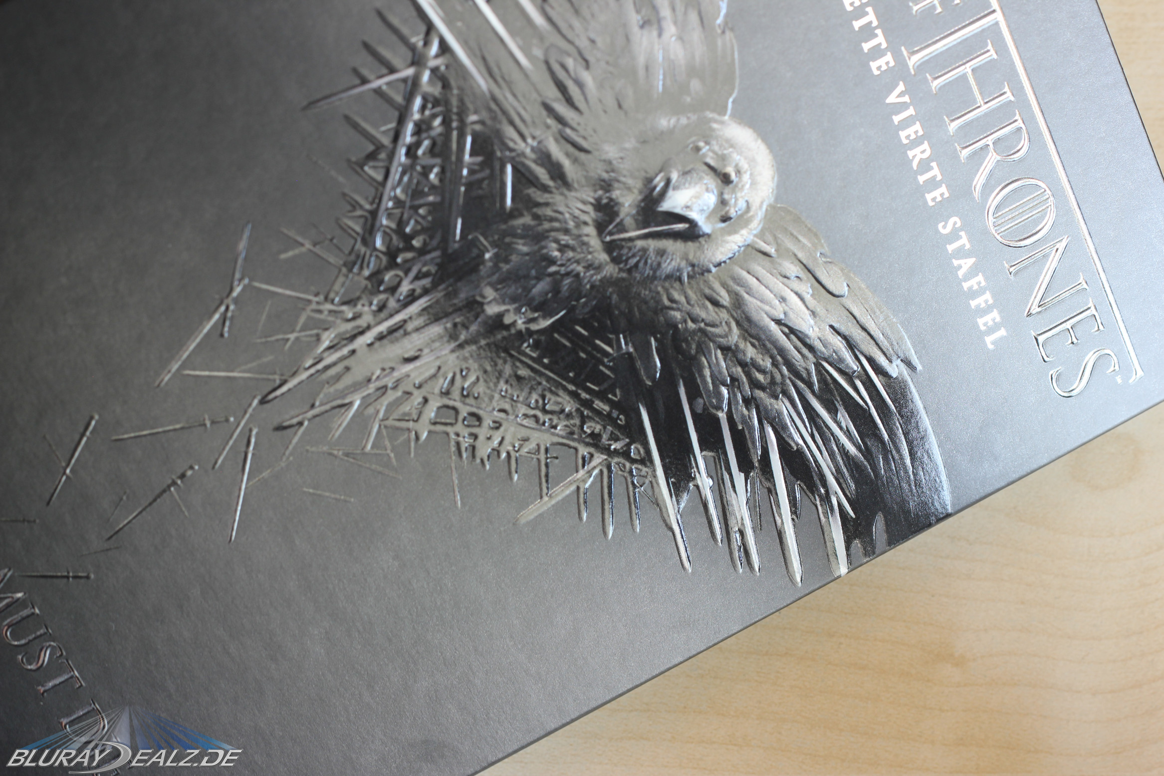 Der Titel „Game of Thrones – Die komplette vierte Staffel“ wie auch seine Pendants auf den Seiten sind allesamt hochwertig geprägt und wirken edel. Das Wappen des Hauses Clegane, welches aus drei schwarzen Hunden auf gelbem Hintergrund besteht, ist leider nicht zusätzlich geprägt.