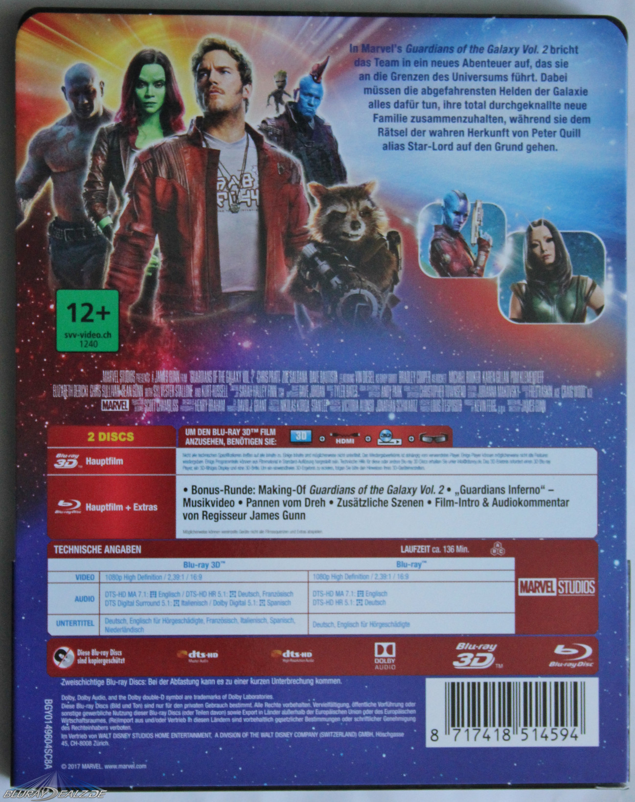 Extras: Audiokommentar von Regisseur James Gunn, Film-Intro von Regisseur James Gunn, Bonus-Runde: Making Of Guardians of the Galaxy Vol. 2, „Guardians Inferno“-Musikvideo, Pannen vom Dreh, Zusätzliche Szenen
