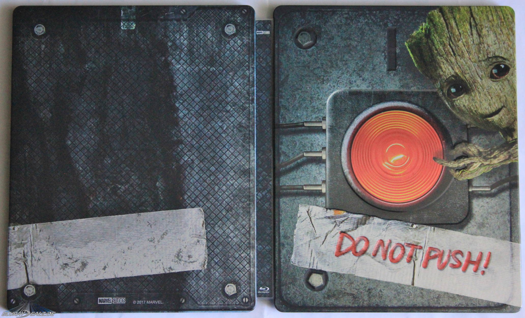 Das Frontmotiv zeigt Baby Groot und seinen Kampf mit dem „Alles zerstören“-Button. Motivtechnisch ist das natürlich toll gewählt, da es eine der besten Szenen des Films aufgreift. Und gleichzeitig das Wunschprodukt von Rocket darstellt, dem das Klebeband im Film selbst fehlt. Der Warnhinweis für Groot („Do not push“) ist dabei tiefengeprägt (debossed) und sowohl Klebeband, Baby Groot, der rote Button als auch die einzelnen Schrauben und Drähte sind in Hochglanzoptik (Spot Gloss) gehalten. Der restliche Hintergrund ist matt. Zusätzlich ist der rote Button ebenfalls mehrfach geprägt wie auch die Schrauben und kleinere Begebenheiten der Oberfläche. Das sieht extrem toll aus und ist verarbeitungstechnisch ein echtes Highlight. Besonders hervorzuheben ist die perfekte Passgenauigkeit der Prägung!